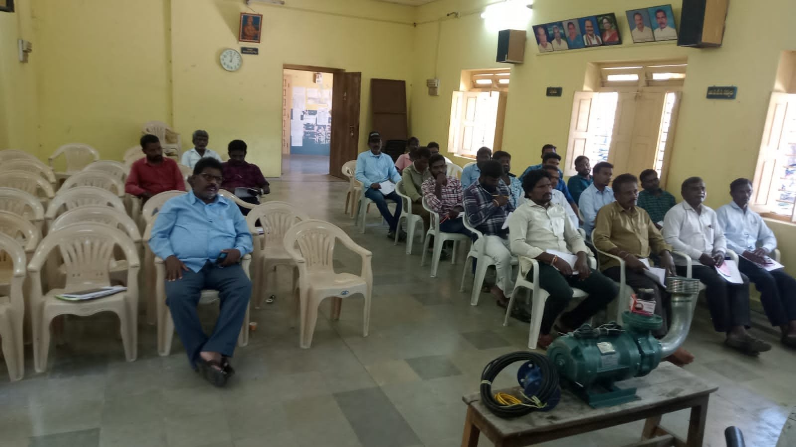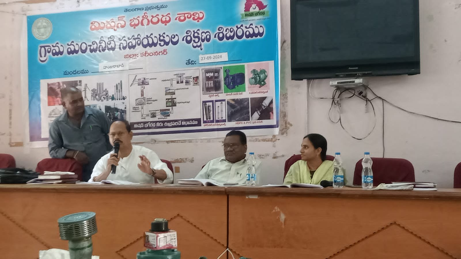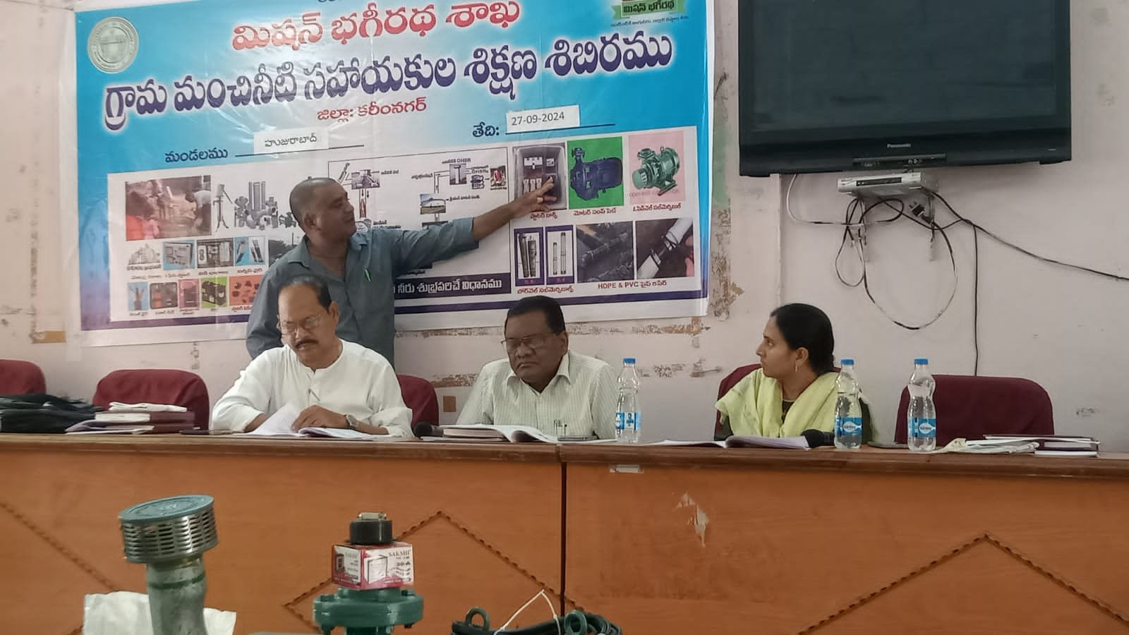 మండల యాదగిరి, స్వర్ణోదయం ప్రతినిధి హుజురాబాద్: హుజురాబాద్ మండలంలోని గ్రామపంచాయతీలలో మంచినీటి సహాయకులుగా విధులు నిర్వహించే వారికి శుక్రవారం హుజురాబాద్ మండల పరిషత్ కార్యాలయావరణంలో శిక్షణ శిబిరం నిర్వహించారు. ఈ కార్యక్రమంలో భాగంగా నాలుగో రోజున కరెంటు మోటార్ సింగల్ మరియు త్రి ఫేస్ పానాల్ బోర్డు నిర్వహణ మరియు మరమ్మాత్తులు చేయించడం గూర్చి శిక్షణ ఇవ్వడం జరిగింది. కరీంనగర్ నుండి వచ్చిన ఎలక్ట్రికల్ మాస్టర్ ట్రేనర్ రాజకుమార్ ప్రయోగపూర్వకంగా వివరించడం జరిగింది. ఈ కార్యక్రమంలో మిషన్ భగీరథ గ్రిడ్ డిఈ టి బాలరాజు, మిషన్ భగీరథ ఇంట్రా డిఈ ఎండి కాజా వశీయుద్దీన్, ఏఈ మౌనిక ఎంపీడీఓ సునీత, ఎంపీవో సతీషకుమార్, ల్యాబ్ సిబ్బంది సురేష్, కోటిలింగం, వేణుగోపాల్, మధుసూదన్ తదితరులు పాల్గొన్నారు.
