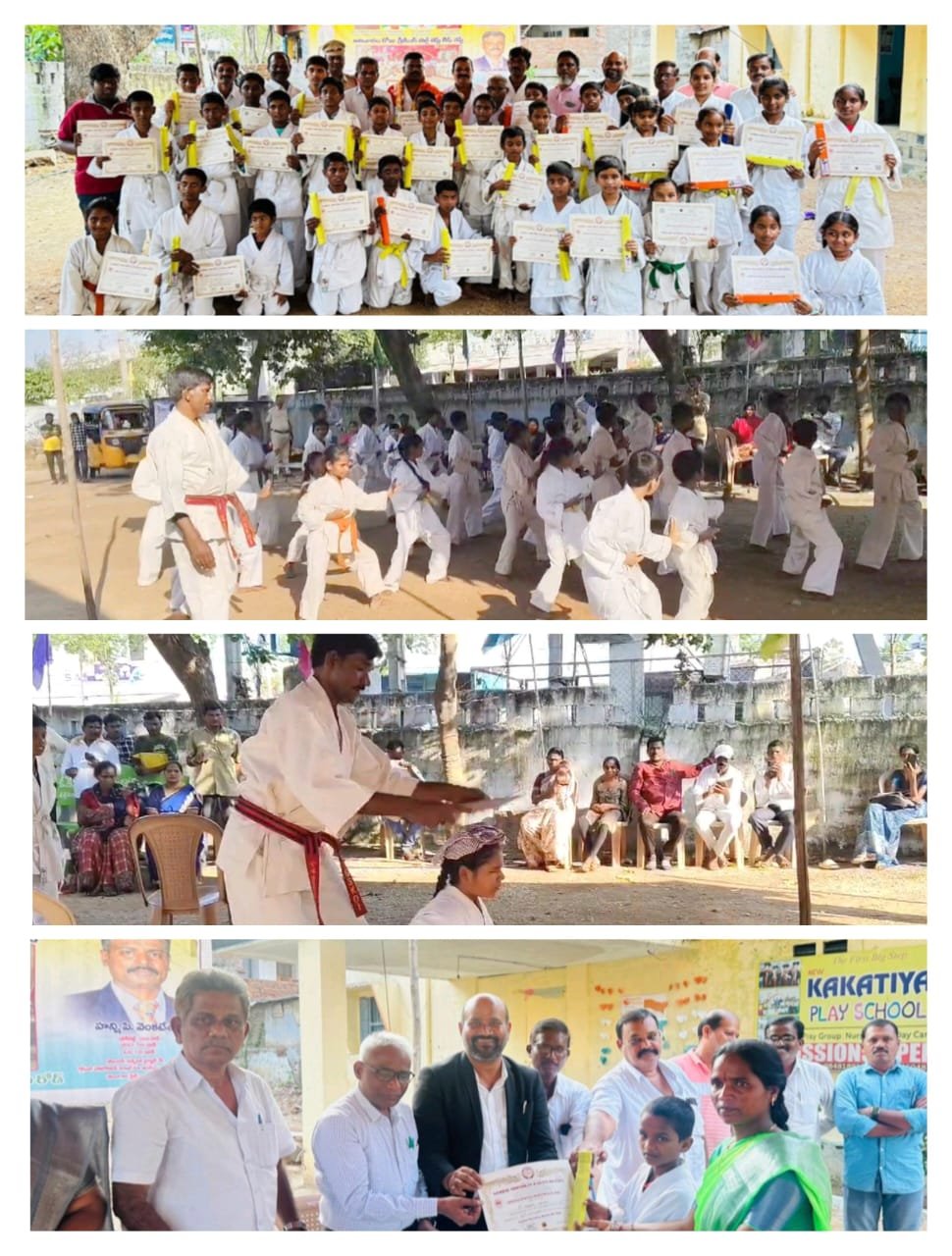 అతిథుల చేతుల మీదుగా అందజేశారు. ఈ సందర్భంగా ముఖ్య అతిథులు మాట్లాడుతూ కరాటే మాస్టర్ జలీల్ గత కొంతకాలంగా ఆత్మవిశ్వాసాన్ని విద్యార్థిని, విద్యార్థులకు పెంపొందించడానికి, చదువుతోపాటు క్రమశిక్షణతో కూడిన జీవన విధానాన్ని అలవాటు చేసుకునే విధంగా విద్యార్థినీ విద్యార్థులకు ఉచిత శిక్షణ ఇస్తూ జిల్లా రాష్ట్ర జాతీయ పోటీలలో విద్యార్థులుగా తయారు చేస్తున్న మాస్టర్ ని అభినందించారు. విద్యార్థినీ విద్యార్థులు ఎలాంటి చెడు వ్యసనాలకు దూరంగా ఉంటూ బంగారు భవిష్యత్తుకు బాటలు వేసే దశలో పయనించాలని స్మార్ట్ ఫోన్ అనే మహమ్మారి కి అలవాటు అయి సమయాన్ని వృధా చేసుకోవద్దని పిలుపునిచ్చారు. నిరుపేదలైనటువంటి తల్లిదండ్రుల కలలను సాకారం అయ్యే విధంగా సత్ప్రవర్తనలో కూడిన చదువును చదివి పేదరికాన్ని నిర్మూలించాలని అన్నారు. విద్యార్థినీ విద్యార్థులు చేసిన అద్భుతమైన విన్యాసాలకు అతిథులు ఆశ్చర్యపోయారు. ఈ సందర్భంగా అతిథులు విద్యార్థినీ విద్యార్థులను, వారి తల్లిదండ్రులను అభినందించారు. అనంతరం గ్రాండ్ కరాటే మాస్టర్ వెంకటేశం, మాస్టర్ ఎండి జలీల్ ను పూలమాలవేసి శాలువతో ఘనంగా సన్మానించారు. ఈ కార్యక్రమంలో గ్లోబల్ శోటా కాన్ కరాటే డో ఇండియా అసోసియేషన్ కరీంనగర్ జిల్లా గౌరవ అధ్యక్షులు అంబాల ప్రభాకర్ ప్రభు హుజురాబాద్ మున్సిపల్ చైర్పర్సన్ గందె రాధిక, టౌన్ ఎస్సై మహమ్మద్ యూనిస్ అలీ సాంఘిక సంక్షేమ గురుకుల పాఠశాల / కళాశాల ప్రిన్సిపల్ లచ్చయ్య, తెలంగాణ రాష్ట్ర ఎస్సీ ఎస్టీ బీసీ మైనారిటీ ఉద్యోగుల సంఘం రాష్ట్ర అధ్యక్షులు మహమ్మద్ ముజాహిద్ హుస్సేన్, ప్రభుత్వ పెన్షనర్స్ సంఘం జిల్లా అధ్యక్షులు చందుపట్ల జనార్ధన్, ముప్పై వ వార్డు కౌన్సిలర్ తోట రాజేంద్రప్రసాద్, మైనార్టీ నాయకులు మహమ్మద్ సలీం,