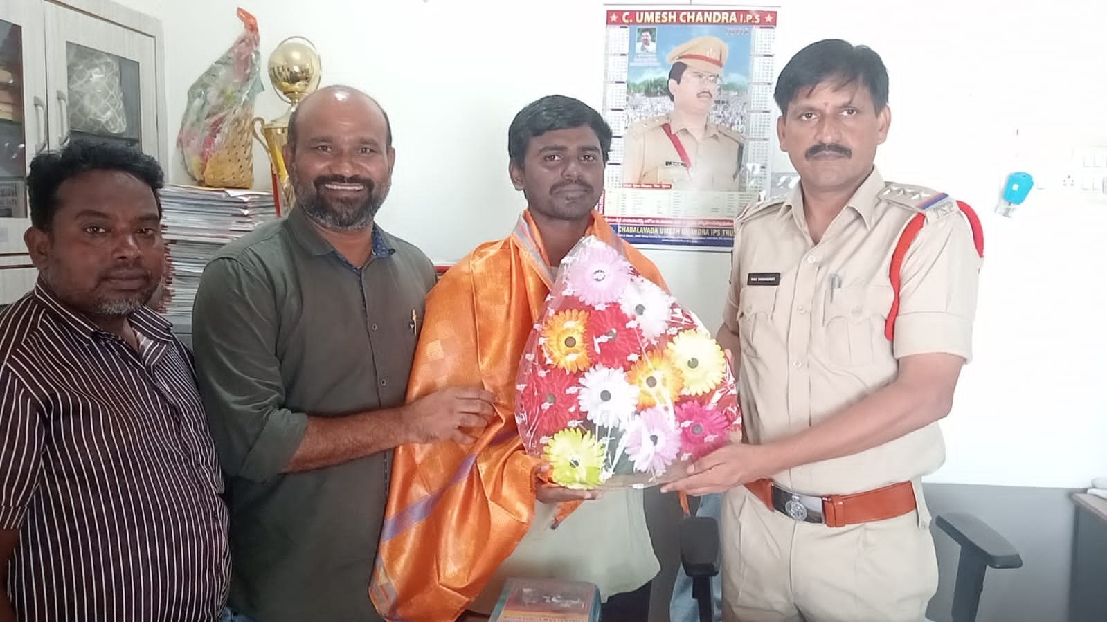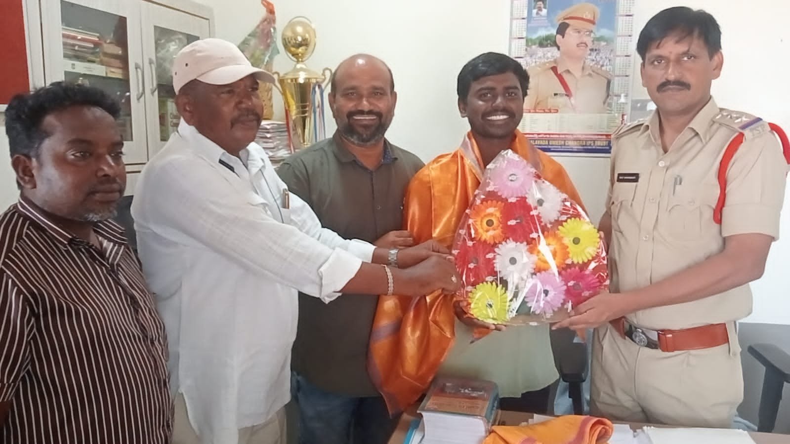 మండల యాదగిరి, స్వర్ణోదయం ప్రతినిధి హుజురాబాద్: జమ్మికుంట మున్సిపాలిటీ పరిధిలోని 29వ వార్డుకు చెందిన ఆకునూరు స్వరూప -రాజుల మొదటి కుమారుడు ఆకునూరు వినయ్ ఒకటి కాదు రెండు కాదు, ఒక సంవత్సర కాలంలోనే నాలుగు ప్రభుత్వ ఉద్యోగాలు సాధించిన సందర్భంగా జమ్మికుంట పోలీస్ స్టేషన్లో మర్యాద పూర్వంగా పిలిచి శాలువతో సత్కరించి పూల బొకేతో జమ్మికుంట (సిఐ) ఇన్స్పెక్టర్ వి రవి ఘనంగా అభినందించారు. 2023 సం.లో కేంద్రీయ విద్యాలయంలో టి జి టి (పి & హెచ్. ఈ) 2024 ఫిబ్రవరి లో గురుకులం స్కూల్ ఫిజికల్ డైరెక్టర్ ( పి. డి) ఇటీవల వెలువడిన డి ఎస్సి ఫిజికల్ ఎడ్యుకేషన్ టీచర్ (పి ఈ టి ) కరీంనగర్ జిల్లా మొదటి విజేత, డి ఎస్సీ స్కూల్ అసిస్టెంట్ (ఫిజికల్ ఎడ్యుకేషన్) సాధించడం గర్వ కారణమని తెలిపారు.