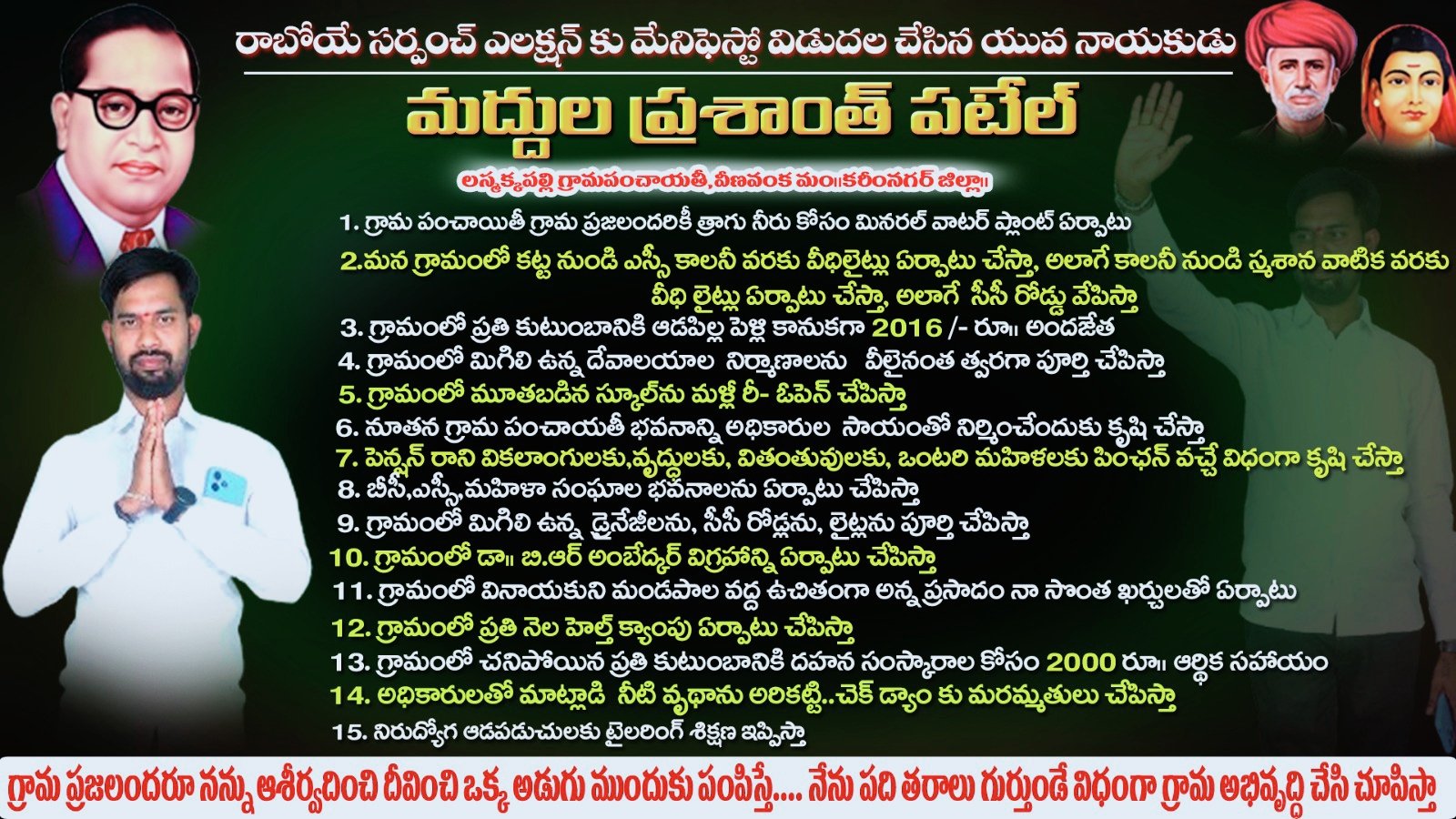 మండల యాదగిరి, స్వర్ణోదయం ప్రతినిధి హుజురాబాద్: నన్ను గెలిపించండి..పది తరాలు గుర్తుండిపోయేలా అభివృద్ధి చేస్తా అంటూ ‘స్థానిక’ ఎన్నికలకు నోటిఫికేషన్ రాకమునుపే బరిలో సర్పంచ్ అభ్యర్థిగా మద్దుల ప్రశాంత్ వినూత్నంగా ప్రచారం చేయడం పలువురిని ఆకర్షిస్తుంది. ఆశావహులు ఎలక్షన్స్ బరిలో నిలిచేందుకు సిద్ధమవుతున్నారు. రాష్ట్ర ప్రభుత్వం ఇంకా లోకల్ బాడీ ఎలక్షన్స్ నిర్వహణకు సంబంధించిన నోటిఫికేషన్ రిలీజ్ చేయలేదు. కానీ, త్వరలో విడుదల చేయబోతున్నదనే అంచనాతో ఆశావహులు ముందే బరిలో నిలిచి గెలిచే ప్రయత్నాలు చేస్తున్నారు. పవర్లోకి వస్తే తామేం చేస్తామో ముందే చెప్పేస్తున్నారు. కరీంనగర్ జిల్లా వీణవంక మండల పరిధిలోని లస్మక్కపల్లి గ్రామానికి చెందిన యువనేత ప్రశాంత్ పటేల్ మద్దుల సర్పంచ్ ఎన్నికల్లో పోటీ చేసేందుకు రెడీ అవుతున్నారు. ఈ క్రమంలోనే బుధవారం సర్పంచ్ ఎన్నికల మేనిఫెస్టోను విడుదల చేశారు. తనను ఒకసారి ఆశీర్వదిస్తే..పది తరాలు గుర్తుండిపోయే విధంగా అభివృద్ధి చేస్తానని హామీనిచ్చారు. గ్రామంలోని ప్రతి కుటుంబంలో ఆడపిల్ల పెండ్లి భారం కాకూడదనే ఉద్దేశంతోనే ఆడబిడ్డ పెండ్లికి కానుకగా రూ.2,016, గ్రామ ప్రజలందరికీ ఉచిత తాగునీరు, నిరుద్యోగ ఆడపడుచులకు టైలరింగ్ లో శిక్షణ ఇప్పించుట, గ్రామంలో డాక్టర్ బీ.ఆర్.అంబేడ్కర్ విగ్రహం ఏర్పాటు, వీధిలైట్ల ఏర్పాటు, సీసీ రోడ్ల నిర్మాణం, ప్రతి నెలా హెల్త్ క్యాంప్ ఏర్పాటు, ఏటా వినాయక మండపాల్లో అన్నప్రసాదం సొంత ఖర్చుతో ఏర్పాటు, మహిళా సంఘాల భవనాల ఏర్పాటుకు కృషి, అర్హులైన వారికి పింఛన్ వచ్చేలా కృషి, మూతపడిన స్కూల్ రీ ఓపెనింగ్, గ్రామస్తులెవరైనా చనిపోతే అంతిమ సంస్కారాల కోసం రూ.2 వేల ఆర్థిక సాయం వంటి హామీలతో ఎన్నికల మేనిఫెస్టోను ప్రశాంత్ పటేల్ విడుదల చేశారు. లస్మక్కపల్లి గ్రామంలో ఇప్పటికే పలు సామాజిక కార్యక్రమాలను ప్రశాంత్ చేపట్టారు. గ్రామానికి వచ్చే దారిలో అడ్డుగా ఉన్న చెట్ల తొలగింపుతో పాటు రోడ్డు మార్గంలో సొంత నిధులతో మొరం పోయించడం, సీజనల్ డిసీజెస్ నేపథ్యంలో హెల్త్ క్యాంప్ ఏర్పాటు వంటివి చేసిన మద్దుల ప్రశాంత్ పటేల్.. రానున్న సర్పంచ్ ఎన్నికల్లో బరిలో నిలిచేందుకు సమాయత్తమవుతున్నారు. అయితే, కనీసంగా నోటిఫికేషన్ రాకముందే యువనేత ప్రశాంత్ పటేల్ సొంత మేనిఫెస్టో విడుదల చేయడం గ్రామంతో పాటు మండల, నియోజకవర్గ రాజకీయ వర్గాల్లో చర్చనీయాంశమవుతోంది. ఎన్నికలకు సంసిద్ధమవుతున్న క్రమంలో అందరికంటే ముందు వరుసలో నిలిచేందుకు యువలీడర్ ప్రశాంత్ ఇలా చేసి ఉంటారని పలువురు అభిప్రాయపడుతున్నారు.