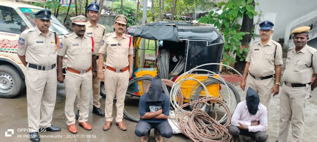 మండల యాదగిరి, స్వర్ణోదయం ప్రతినిధి హుజురాబాద్: జమ్మికుంట మున్సిపల్ పరిధిలోని దుర్గా కాలనీలో ఉన్న రైల్వే శాఖకు చెందిన ఒక ప్రైవేటు కాంట్రాక్టర్ గోదాంలో నిల్వ ఉంచిన సుమారు నాలుగున్నర లక్షల విలువ చేసే కాపర్ వైర్ ను నవంబర్ 29వ తేదీన గోదాం సెట్టర్ తాళాలు పగల కొట్టి కాపర్ సుమారు 500 కేజీల వైరును దొంగిలించిన ఇద్దరు వ్యక్తులను జమ్మికుంట పోలీసులు చాకచక్యంగా 48 గంటల్లో పట్టుకోవడం జరిగిందని సిఐ వీ రవి తెలిపారు. బండావతి సందీప్ అనే వ్యక్తి మరో వ్యక్తి బాలుతో కలిసి నవంబర్ 29న సుమారు 5 లక్షల విలువచేసే కాపరువైరును దొంగతనం చేసి కీసర మండలం నాగారం గ్రామానికి చెందిన హేమ కనకయ్య అనే వ్యక్తికి విక్రయించినట్లు తెలిసింది. దొంగతనం జరిగినట్లు గోడౌన్ ఇంచార్జ్ జగదీష్ దాస్ ఇచ్చిన ఫిర్యాదు మేరకు కేసు నమోదు చేసిన పోలీసులు విచారణ జరిపి సీసీ కెమెరాలు ఆధారంగా దర్యాప్తు చేసి దొంగలను పట్టుకున్నట్లు సిఐ తెలిపారు. దొంగతనానికి పాల్పడిన వ్యక్తులను చాకచక్యంగా పట్టుకొని కేసును చేదించిన జమ్మికుంట పట్టణ ఎస్ఐ ఆరోగ్యం, హెడ్ కానిస్టేబుల్ నెల్లి మోహన్, సదయ్య, సంపత్ లతోపాటు కానిస్టేబుల్ వేణు మిగతా సిబ్బందిని సిఐ అభినందించారు.