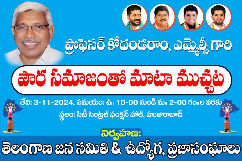 మండల యాదగిరి, స్వర్ణోదయం ప్రతినిధి హుజురాబాద్: నవంబర్ 3 ఆదివారం రోజున, హుజురాబాద్ సిటీ సెంట్రల్ లో జరిగే ‘పౌర సమాజంతో కోదండరాం మాటా ముచ్చట’ కార్యక్రమాన్ని విజయవంతం చేయాలని టీజేఎస్, ప్రజా, ఉద్యోగ సంఘాల నాయకులు పిలుపునిచ్చారు. ఎమ్మెల్సీ గా నియామకమై మొదటిసారిగా హుజురాబాద్ పట్టణానికి వస్తున్న సందర్భంగా టీజేఎస్, పౌర, ఉద్యోగ, ప్రజా సంఘాల ఆధ్వర్యంలో పౌర సమాజం తో కోదండరాం మాటా ముచ్చట కార్యక్రమం నిర్వహిస్తుట్లు వారు తెలిపారు. ఉదయం 10 గంటల నుంచి మధ్యాహ్నం 2 గంటల వరకు జరిగే ఈ కార్యక్రమంలో అన్ని వర్గాల ప్రజలు, విద్యార్థులు, మేధావులు, ఉద్యమ కారులు పాల్గొని విజయవంతం చేయాలని పిలుపునిచ్చారు. ఈ కార్యక్రమంలో టీజేఎస్ ఉమ్మడి కరీంనగర్ జిల్లా ఇంచార్జీ ముక్కెర రాజు, ప్రజా, ఉద్యోగ సంఘాల నాయకులు పల్కల ఈశ్వర్ రెడ్డి, వేల్పుల రత్నం, మార్త రవీందర్, భీమోజు సదానందం, కొత్తూరి రమేష్, పాక సతీష్, వేల్పుల ప్రభాకర్, సొల్లు బాబు తదితరులు పాల్గొన్నారు.