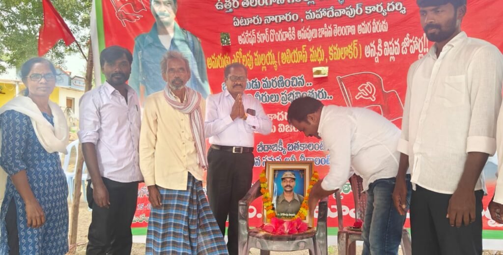 మండల యాదగిరి, స్వర్ణోదయం ప్రతినిధి కరీంనగర్: ప్రజల కోసం ప్రాణ త్యాగం చేసిన మావోయిస్టు రాష్ట్ర కమిటీ సభ్యులు మధు అలియాస్ మల్లన్న ఎన్కౌంటర్ లో మృతి చెందిన పెద్దపల్లి జిల్లా రానాపూర్ గ్రామంలో టిపిసిసి ఎస్సీ డిపార్ట్మెంట్ అట్రాసిటీ రాష్ట్ర ఇంచార్జ్ తిప్పారపు సంపత్ నివాళులర్పించారు. అనంతరం ఆయన మాట్లాడుతూ ములుగు జిల్లా వాజేడు ప్రాంతంలో గత వారం రోజుల కిందట ఎన్కౌంటర్లో మృతి చెందిన ఏడుగురు మావోయిస్టులలో ఆరుగురు మావోయిస్టులు చత్తీస్గడ్ రాష్ట్రానికి చెందిన వారు కాగా తెలంగాణ రాష్ట్రము పెద్దపెల్లి జిల్లా రానాపూర్ గ్రామానికి చెందిన మావోయిస్టు నేత మధు అలియాస్ మల్లన్న మృతి చెందడం చాలా బాధాకరం అన్నారు. మధు అన్న గత 30 సంవత్సరాల నుండి ప్రజల కోసం తన జీవితాన్ని త్యాగం చేసి ఉద్యమ బాట పట్టాడు అని పేర్కొన్నారు. తన తల్లిదండ్రులు, భార్య, కూతురు మధు అన్న మృతిపై శోక సముద్రంలో మునిగి తేలుతున్నారని, వారి కుటుంబానికి తన భార్య మీనా అక్కకు ధైర్యం కోల్పోవద్దని తన కూతురిని ఉన్నత చదువులు చదివిపించాలని తన కుటుంబానికి అండగా ఉంటానని ఆత్మ ధైర్యాన్ని నింపుతూ వారికీ 200 కేజీల బియ్యం సహాయం చేయడం జరిగిందన్నారు. ఈ కార్యక్రమంలో ఎమ్మార్పీఎస్ జాతీయ ఉపాధ్యక్షులు రుద్రారపు రామచంద్రంమాదిగ, పౌర హక్కుల సంఘం నాయకులు గడ్డం సంజీవ్, టిపిసిసి లీగల్ సెల్ జాయింట్ కన్వీనర్ జీడి రవితేజ తదితరులు పాల్గొన్నారు.