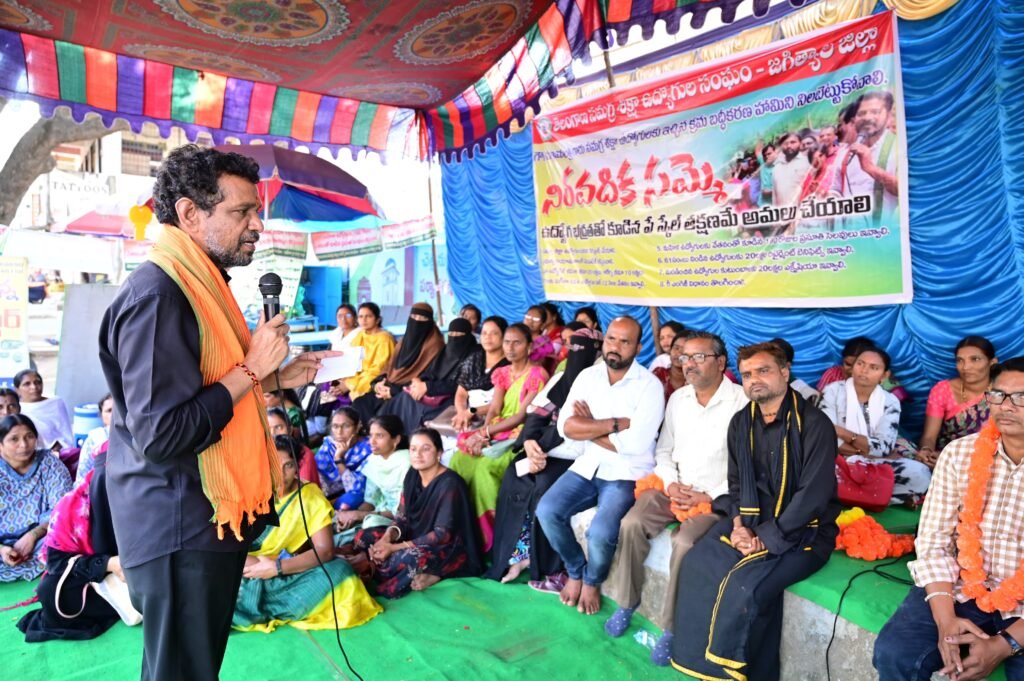 మండల యాదగిరి, స్వర్ణోదయం ప్రతినిధి జగిత్యాల :సమగ్ర శిక్ష అభియాన్ (ఎస్ఎస్ఏ) ఉద్యోగుల సమస్యలను ప్రభుత్వం దృష్టికి తీసుకెళ్లి పరిష్కరించేందుకు కృషి చేస్తానని కరీంనగర్ -అదిలాబాద్ – నిజామాబాద్ -మెదక్ పట్టభద్రుల ఎమ్మెల్సీ అభ్యర్థి అల్ఫోర్స్ నరేందర్ రెడ్డి స్పష్టం చేశారు. బుధవారం జగిత్యాల జిల్లా కేంద్రంలో గత కొన్ని రోజులుగా తమ డిమాండ్లు పరిష్కరించాలని చేపట్టిన సమ్మెకు సంఘీభావం తెలిపి మాట్లాడారు. ఈ సందర్బంగా ఆయన మాట్లాడుతూ సమగ్ర శిక్ష ఉద్యోగులకు రేవంత్ ప్రభుత్వం న్యాయం చేస్తుందని, ఎవరు ఆందోళన పడొద్దని ..ప్రభుత్వం ఇచ్చిన హామీలను నిలబెట్టు కుంటుందని, ఉద్యోగులందరికి న్యాయం జరిగే విధంగా వారి సమస్యలను ప్రభుత్వం దృష్టికి తీసుకెళ్లి పరిష్కరించేందుకు కృషి చేస్తానని అన్నారు.