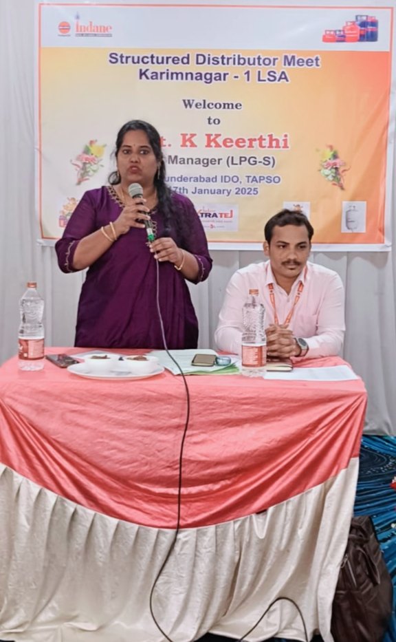 కరీంనగర్ లోని కెయస్ వేడుకల మందిరంలో శుక్రవారంనాడు నిర్వహించిన కరీంనగర్ సేల్స్ ఏరియా1 ఇండేన్ గ్యాస్ డీలర్ల సమావేశంలో ఆమె ముఖ్య అతిథిగా పాల్గొన్నారు. రానున్న కాలంలో వంటగ్యాస్ వ్యాపారాన్ని ప్రవేట్ సంస్థలు చేపట్టె అవకాశాలు వున్నాయని వారికి దీటుగా కస్టమర్లకు సేవలందిస్తే మనం కస్టమర్లను కాపాడుకునేందుకు అవకాశం వుంటుందని తెలిపారు. ఇది ఒక్క ఐఓసియల్ కే కాక అన్ని కంపెనీలకు వర్తిస్తుందని తెలిపారు. గ్యాస్ వాడకందారులకు సిలిండర్లు అందించే సమయంలో ప్రీడెలివరి చెక్ (పిడిసి) డెలివరి సిబ్బంది నిర్వహించాలని ముఖ్యంగా సిలిండర్ సీల్ తొలగించడం వాల్వు వుండే ఓ రింగ్ గమనించడం, సిలిండర్ నాణ్యత,తూకం గమనించాలని కోరారు. ఐఓసియల్ నిర్వహించిన బేసిక్ సేప్టీ చెక్ ప్రాథమిక భద్రతా తనికీ కార్యక్రమంలో ఇంటింటికీ తిరిగి వారు వాడే గ్యాస్ కనెక్షన్లు పరిశీలించి భద్రతపై అవగాహన కల్పించేందుకు చొరవచూపామని తెలిపారు. ఇందులో గ్యాస్ లీకేజి సమయంలో 1906 టోల్ ఫ్రీ నంబరుకు ఫిర్యాదులు చేయడం, కాలం చెల్లిన సురక్ష రబ్బరు ట్యూబ్ మార్చడం, కస్టమర్ ఏ కంపనీకి చెందిన సిలిండర్, రెగ్యలేటర్ వాడుతున్నారో అవే కలిగి వుండాలని సూచించారు.