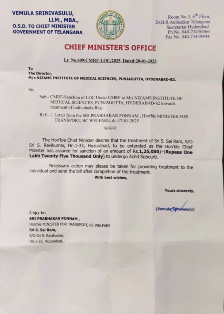 హుజురాబాద్ మున్సిపల్ పరిధిలోని బోర్నపల్లి 14వ వార్డుకు చెందిన సమ్మెట సాయిరాం ప్రాణాపాయ స్థితిలో ఉన్నాడని, త్వరగా గుండెకి సర్జరీ చేయాల్సిన పరిస్థితి ఉందని తెలిసి హుజురాబాద్ కు చెందిన ప్రముఖ సామాజికవేత్త సబ్బని వెంకట్ సీఎంఓ ఆఫీస్ నుంచి రూ. లక్ష 25 వేల ఎల్ఓసి ఇప్పించి ఆదుకున్నాడు. సాయిరాం చిన్నప్పుడే తండ్రిని కోల్పోయి ఆర్ధిక పరిస్థితి బాగాలేదని వెంకట్ అనుచరుడు మేడుదుల అర్జున్ ద్వారా తెలిసిన వెంటనే ప్రముఖ సామాజికవేత్త సబ్బని వెంకట్ స్పందించి ప్రభుత్వ దృష్టికి తీసుకెళ్లి గంటల వ్యవధిలోనే వైద్యఖర్చుల కోసం కావాల్సిన రూ . 1,25,000 లు ఎల్ ఓ సి మంజూరు చేయించారన్నారు. ఎల్ ఓసితో పాటు సర్జరీ కి కావాల్సిన రక్తం కూడా వెంకట్ ఏర్పాటు చేసారని తెలిపారు. అడగకుండానే ఆదుకున్న సబ్బని వెంకట్ కు సాయిరాం కృతజ్ఞతలు తెలిపారు.