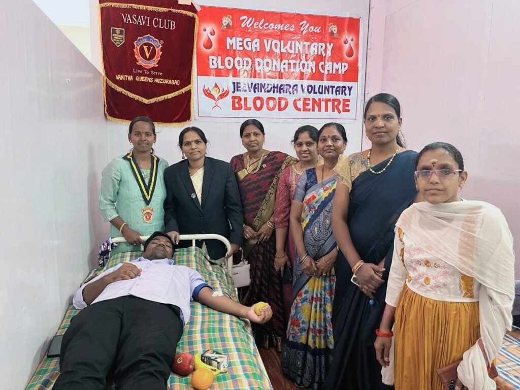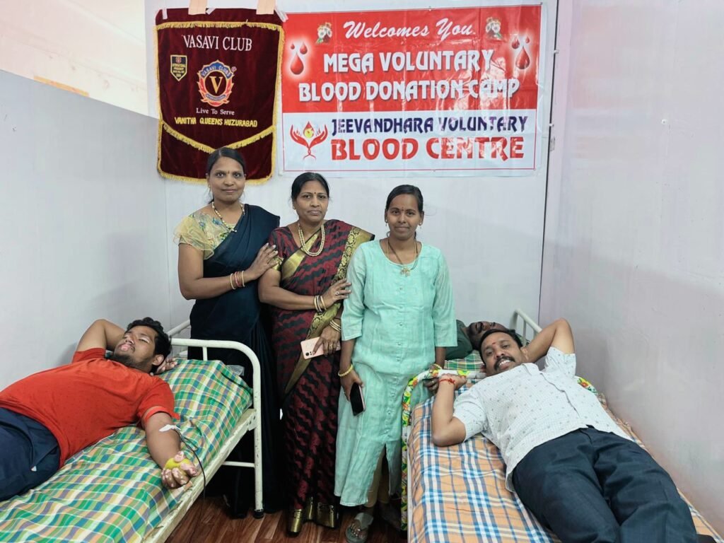 మండల యాదగిరి, స్వర్ణోదయం ప్రతినిధి హుజురాబాద్: వాసవి వనిత క్వీన్స్ క్లబ్ హుజూరాబాద్ వారి ఆధ్వర్యంలో ఈ రోజు శ్రీ మేధా హాస్పిటల్ హుజూరాబాద్ లో రక్తదాన శిబిరాన్ని ఏర్పాటు చేశారు. ఇందులో క్లబ్ సభ్యులు అందరు పాల్గొని రక్తదానం శిబిరాన్ని విజయవంతం చేశారని క్లబ్ అధ్యక్షురాలు డాక్టర్ నార్ల అర్చన తెలిపారు. రక్త దానం ఒక మనిషి నిండు ప్రాణం అని, ఇలాంటి అవకాశాలు వస్తే ఎవరు వదులుకోకుండా సమాజ సేవలో ముందు ఉండి పాల్గొనాలని ప్రెసిడెంట్ అర్చన తేలిపారు. ఈ కార్యక్రమంలో తాజా మాజీ మున్సిపల్ చైర్ పర్సన్ గందె రాధిక, బ్లడ్ డొనేషన్ ఇంచార్జ్ ముక్క శ్రీనివాస్ మరియు పవిత్రం శ్రీనివాస్, రీజియన్ చైర్మన్ ఐత రమాదేవి, జోనల్ చైర్మన్ శైలజ,