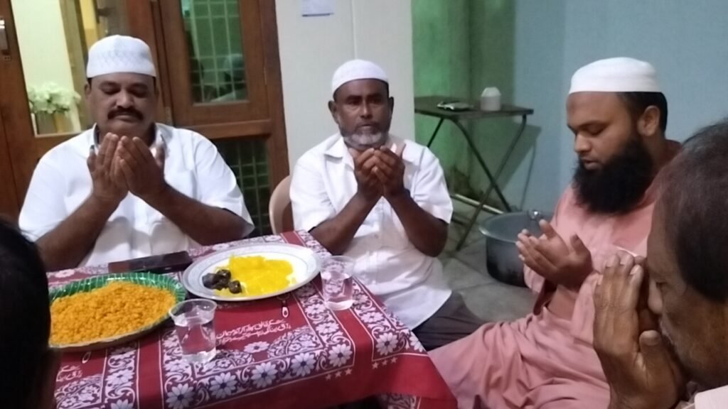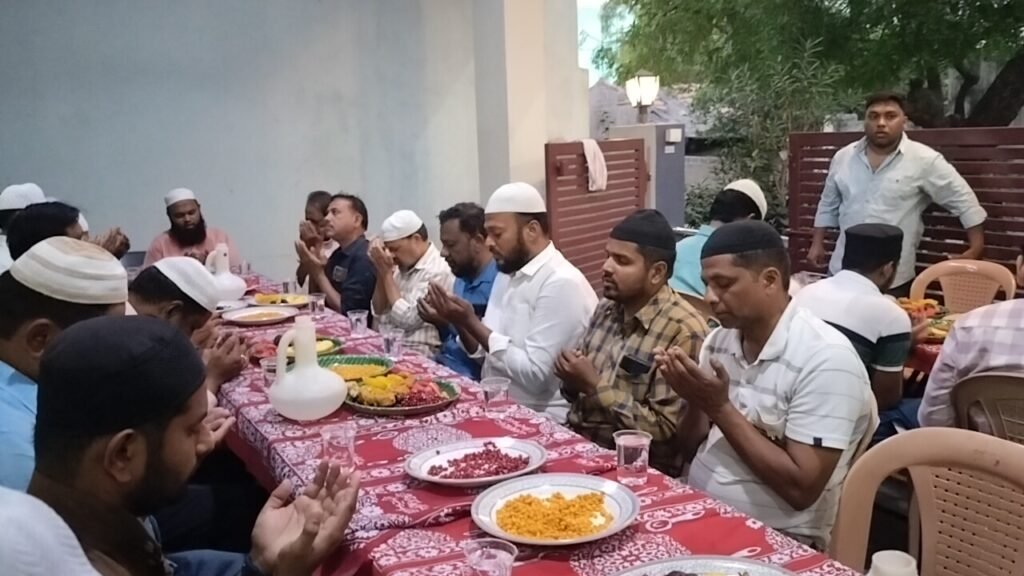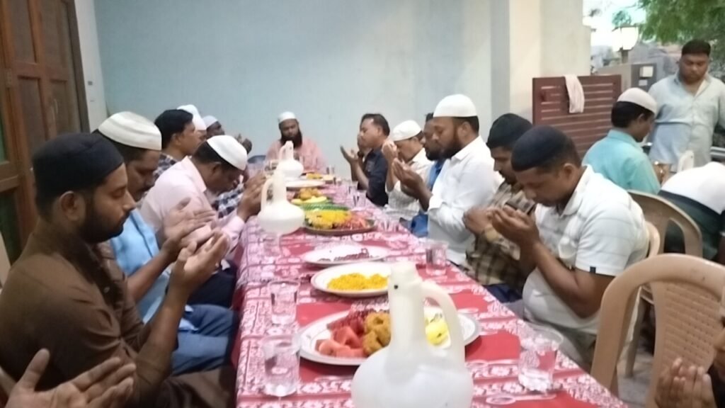 మండల యాదగిరి స్వర్ణోదయం ప్రతినిధి హుజురాబాద్: హుజురాబాద్ పట్టణములో మురాద్ నగర్ లో హుజురాబాద్ జామే మస్జిద్ ఈద్గా కబ్రిస్తాన్ మేనేజ్మెంట్ కమిటీ అధ్యక్షుడి నివాసంలో ఇఫ్తార్ విందు మరియు విందు భోజనాలు ఏర్పాటు చేశారు. హుజురాబాద్ పట్టణం ముస్లిం సోదరులకు ఈరోజు ఇఫ్తార్ విందు ముజహిద్ ఇంటి వద్ద ఇచ్చారు. ఈ కార్యక్రమములోనే హుజురాబాద్ పట్టణం ముస్లిం యువకులు మరియు మత పెద్దలు అధిక సంఖ్యలో భారీగా పాల్గొన్నారు. మరియు ఇఫ్తార్ విందులో భాగంగా ప్రత్యేకంగా అన్ని మతాల కొరకు సుఖసంతోషాల కొరకు ప్రశాంత వాతావరణ ఉండడానికి ప్రత్యేక అల్లాహ్ తో దువా చేసిన మౌలానా మహమ్మద్ ముజల్మిల్ హుస్సేన్ సాహెబ్ దువా చేశారు. ఈ కార్యక్రమంలో ఇమాములు మహమ్మద్ షాకీర్, మహమ్మద్ నహి, మిర్జా ఇమ్రాన్ బిగ్, మహమ్మద్ అమీర్ బాబా, మహమ్మద్ అబ్దుల్ ఫహీమ్, ముస్లిం నాయకులు సయ్యద్ అబ్దుల్ అజీమ్, మున్ను, ఏండి ఫయాజ్, మహమ్మద్ ఇస్మాయిల్, మహమ్మద్ హబీబ్, మహమ్మద్ మురద్ హుస్సేన్, మూషు, ఎండి అలీమ్, మహమ్మద్ అప్సర్, ఎండి నవాబ్ భాష, బాబా, మహమ్మద్ సలీం, మహమ్మద్ మహమ్మద్ కాజా పాషా, ఇమ్రాన్ ఖాన్, మజారుద్దీన్, మహమ్మద్ మాగుల్ హుస్సేన్ పాషా, మహమ్మద్ అబ్దుల్ అజీజ్, బాబా, మహమ్మద్ సలీం, సయ్యద్ మక్సు దౌ సయ్యద్ ఇంతియాజుద్దీన్ సయ్యద్ అబ్దుల్లా, మహమ్మద్ అబ్దుల్, హాలీ మహమ్మద్ ఖాజా అలీ, అహ్మద్ ఇర్ఫాన్, బాబా తదితరులు సోదరులు అధిక సంఖ్యలో పాల్గొన్నారు