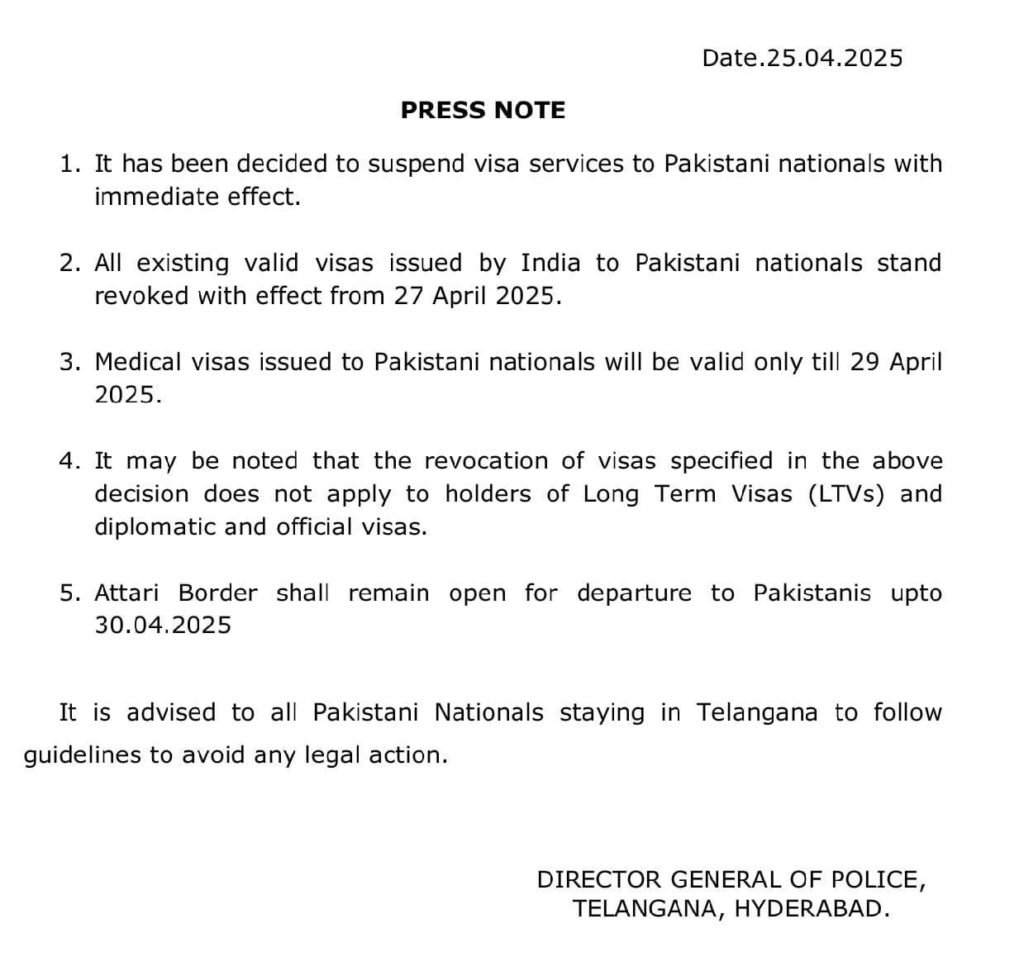 అక్రమంగా తెలంగాణలో ఉంటే న్యాయపరమైన చర్యలు తప్పవని పాకిస్థానీయులను హెచ్చరించిన డీజీపీ జితేందర్ఇప్పటికే ఉన్న అన్ని వీసాలు ఏప్రిల్ 27 నుండి రద్దు చేయబడతాయని.. మెడికల్ వీసాలు మాత్రం ఏప్రిల్ 29 వరకు చెల్లుబాటు అవుతాయని డీజీపీ జితేందర్ తెలిపారు.