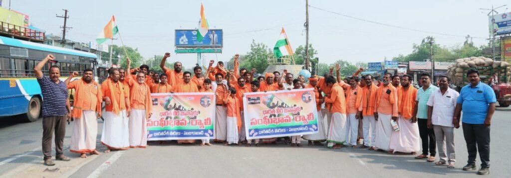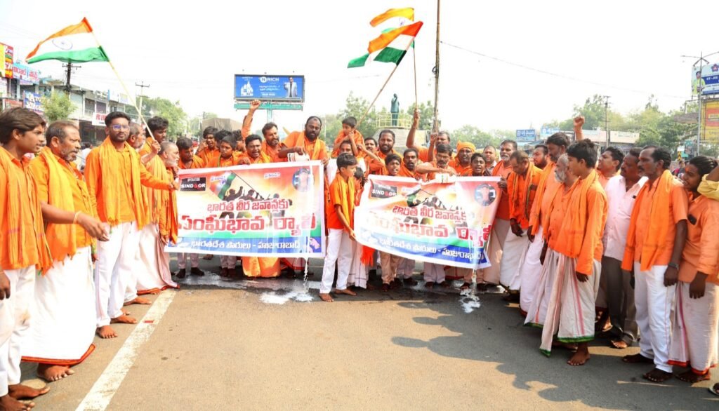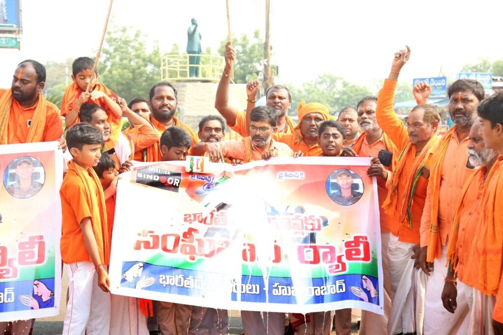 మండల యాదగిరి, స్వర్ణోదయం ప్రతినిధి హుజురాబాద్: ఆపరేషన్ సింధూరం-2 దేశ రక్షణకోసం ప్రాణాలను పణంగా పెట్టీ గస్తీ చేస్తున్న దేశ రక్షణ కవచాలు అయిన వీర జవాన్లకు సంఘీభావంగా హనుమాన్ దీక్ష తీసుకున్న భక్తులందరూ హుజురాబాద్ లోని హనుమాన్ టెంపుల్ నుండి అంబేద్కర్ కూడలి వరకు ర్యాలీగా వచ్చి రెండు నిమిషాలు మౌనం పాటించి, వీర మరణం పొందిన జవాన్లకి పాలాభిషేకం చేసారు. బార్డర్ లో 140 కోట్ల ప్రజల ప్రాణాలను రక్షించడం కోసం వాళ్ళ ప్రాణాలను త్యాగం చేసి మన కోసం గస్తీ కాస్తున్న వీర జవాన్లకు, పాకిస్థాన్ ఉగ్రముకలు జరిపినటువంటి కాల్పుల్లో అమరులైనటువంటి మురళి నాయక్ మరి ఇతర జవాన్లకు సంతాప సూచకంగా రెండు నిమిషాలు మౌనం పాటించారు. ఇందులో భారతదేశం విజయం సాధించాలని ఆకాంక్షించారు. ఈ కార్యక్రమంలో హనుమాన్ దీక్షపరులు జంపాల రామకృష్ణస్వామి, బండి రాజశేఖర్, రమేష్ ఫోటో స్టూడియో, మనీషా స్టూడియో ప్రసాద్, వెంకటేష్, టీవీఎస్ సంజీవరెడ్డి, రాజు, అజయ్, సచిన్, రవి తదితర భక్తులు పాల్గొన్నారు.