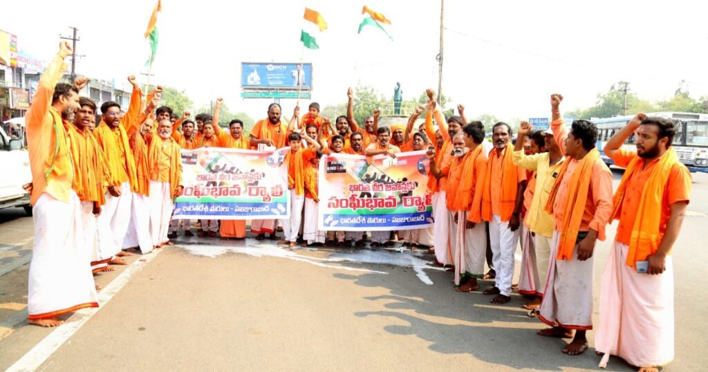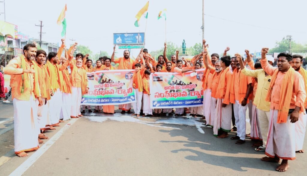 ర్యాలీగా వచ్చి చౌరస్తాలో అమర జవాన్లకు మద్దతుగా నినాదాలు చేస్తున్న హనుమాన్ భక్తులు