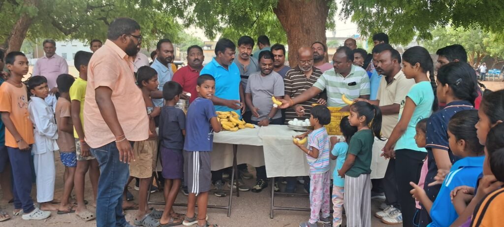 క్రీడాకారులు విద్యార్థులకు పండ్లు, గుడ్లు పంపిణీ చేస్తున్న కమిషనర్ సమ్మయ్య, దాత సతీష్, తదితర వాకర్లు..