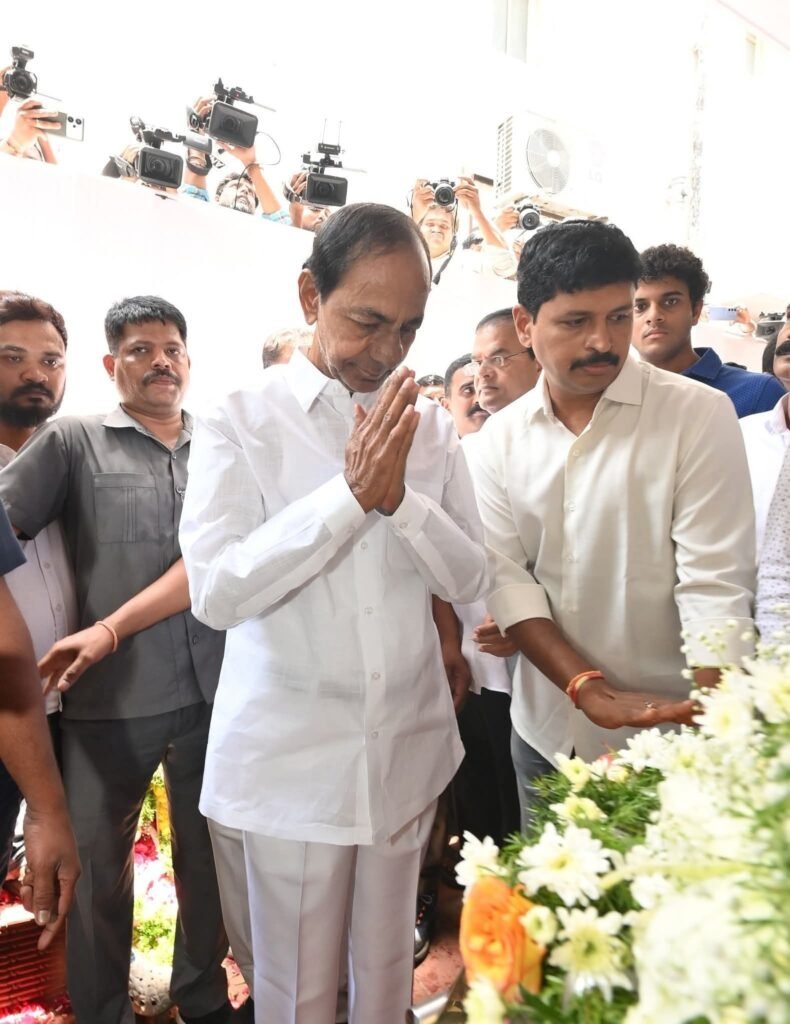 స్వర్ణోదయం ప్రతినిధి హైదరాబాద్ జూన్ 8: అనారోగ్యంతో వైద్య చికిత్స పొందుతూ అకాల మృతి చెందిన పార్టీ సీనియర్ నేత, ఎమ్మెల్యే మాగంటి గోపీనాథ్ గారి పార్థివ దేహాన్ని తెలంగాణ రాష్ట్ర తొలి ముఖ్యమంత్రి, BRS Party అధినేత కేసిఆర్ మాదాపూర్ లోని నివాసంలో సందర్శించి, పుష్పాలు సమర్పించి శ్రద్ధాంజలి ఘటించారు. వారి పవిత్ర ఆత్మకు శాంతి చేకూరాలని ప్రార్థించారు.