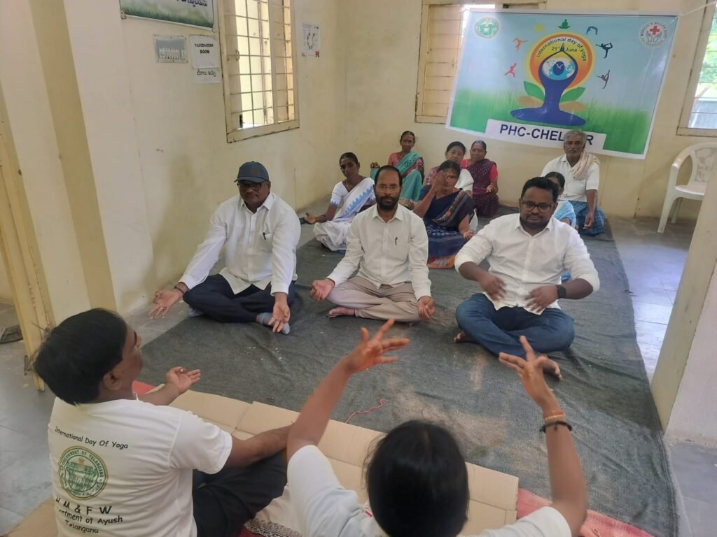 చేల్పూర్ పీహెచ్సీలో యోగ కార్యక్రమం నిర్వహిస్తున్న జిల్లా వైద్య ఆరోగ్య శాఖ ఉపాధికారి డాక్టర్ చందు..