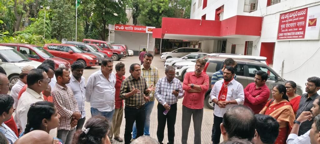 nfpe యూనియన్ అనుబంధ సంఘాల ఉద్యోగులు చీఫ్ పిఎంజీ కార్యాలయం దాక్ సదన్ లో ఒకరోజు సమ్మెలో పాల్గొన్న దృశ్యంలు ..