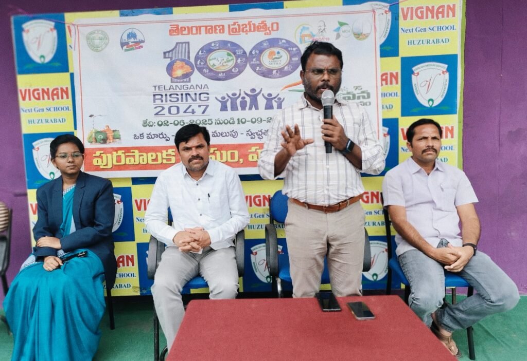 మండల యాదగిరి, స్వర్ణోదయం ప్రతినిధి హుజురాబాద్, జూలై11: పర్యావరణ పరిరక్షణ ప్రతి ఒక్కరి బాధ్యత అని హుజురాబాద్ మున్సిపల్ కమిషనర్ కే సమ్మయ్య పేర్కొన్నారు. హుజురాబాద్ పట్టణంలోని విద్యానగర్ గల విజ్ఞాన్ నెక్స్ట్ జెన్ స్కూల్ లో శుక్రవారం విద్యార్థిని విద్యార్థులకు ” పర్యావరణం పరిరక్షణ – మన బాధ్యత” అనే అంశంపై అవగాహన కార్యక్రమాన్ని ఏర్పాటు చేసినట్లు పాఠశాల కరస్పాండెంట్ దాసరి కోటేశ్వర్ యాదవ్ తెలిపారు.