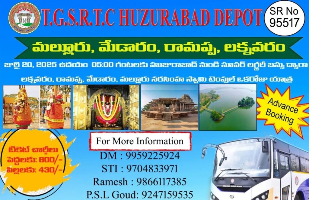 జూలై 20 తేదీన ఉదయం 06:00 గంటలకు హుజురాబాద్ డిపో నుండి ప్రత్యేక బస్ ఏర్పాటు చేశాం అని ప్రయాణికులకు ఈ అవకాశాన్ని వినియోగించూకోవాలని కోరారు. బస్ టికెట్ ధర పెద్దలకు 800 /- మరియు పిల్లలకు 430 /- అడ్వాన్స్ బుకింగ్ కొరకు DM: 9959225924 STI: 9704833971 మరియు 9866117385, 9247159535, 9177324963 సంప్రదించండి అని హుజురాబాద్ డిపో మేనేజర్ రవీంద్రనాథ్ తెలిపారు. అలాగే ప్రయాణికులతో పాటు, విహార యాత్ర కోసం వెళ్ళే వారికి మరియు ప్రభుత్వ పాఠశాల విద్యార్థులకు విజ్ఞాన విహార యాత్రలకు అతి తక్కువ ధరకు స్పెషల్ బస్ ఇస్తాము అని తెలిపారు. ఇట్టి అవకాశాన్ని వినియోగించూకోవాలని హుజురాబాద్ డిపో మేనేజర్ రవీంద్రనాథ్ కోరారు.