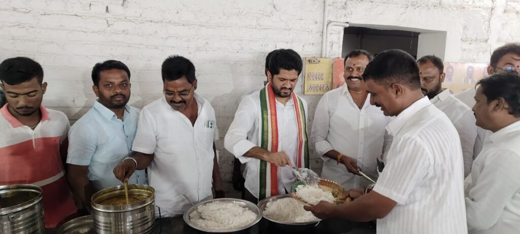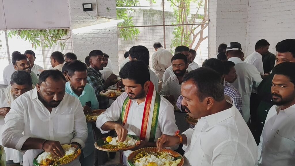 అన్నం వడ్డించి, కార్యకర్తలతో కలిసి తింటున్న ప్రణవ్..