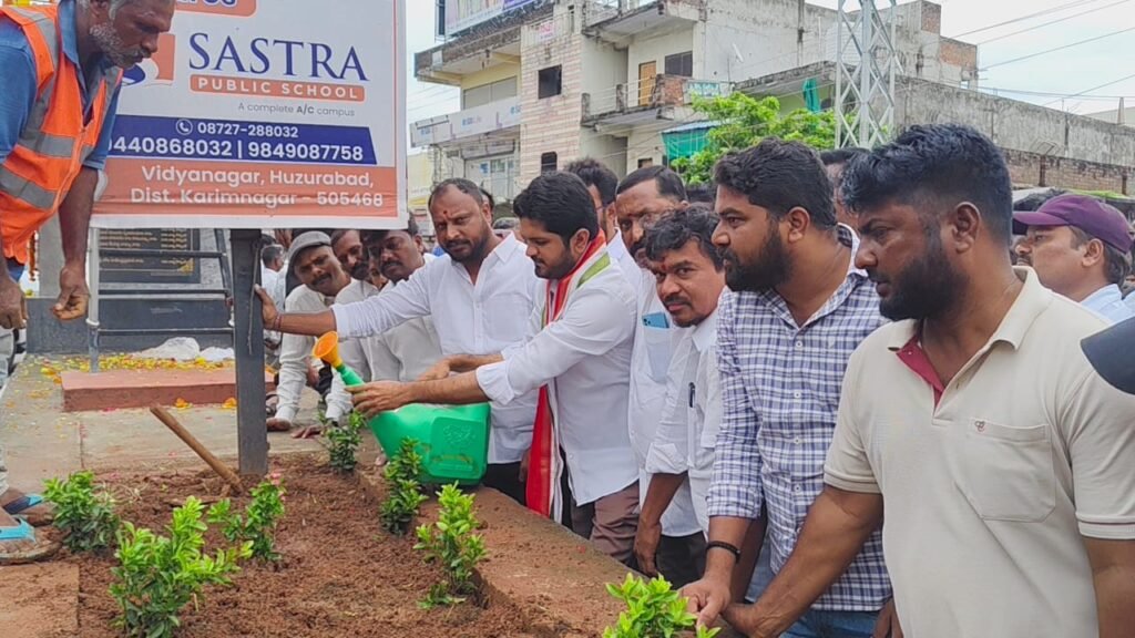 వర్ధంతి సందర్భంగా మెయిన్ రోడ్డులోని డివైడర్లలో మొక్కలు నాటుతూ.. నీళ్లు పోస్తున్న ప్రణవ్..