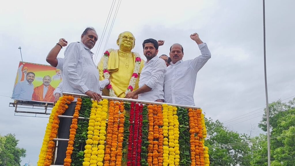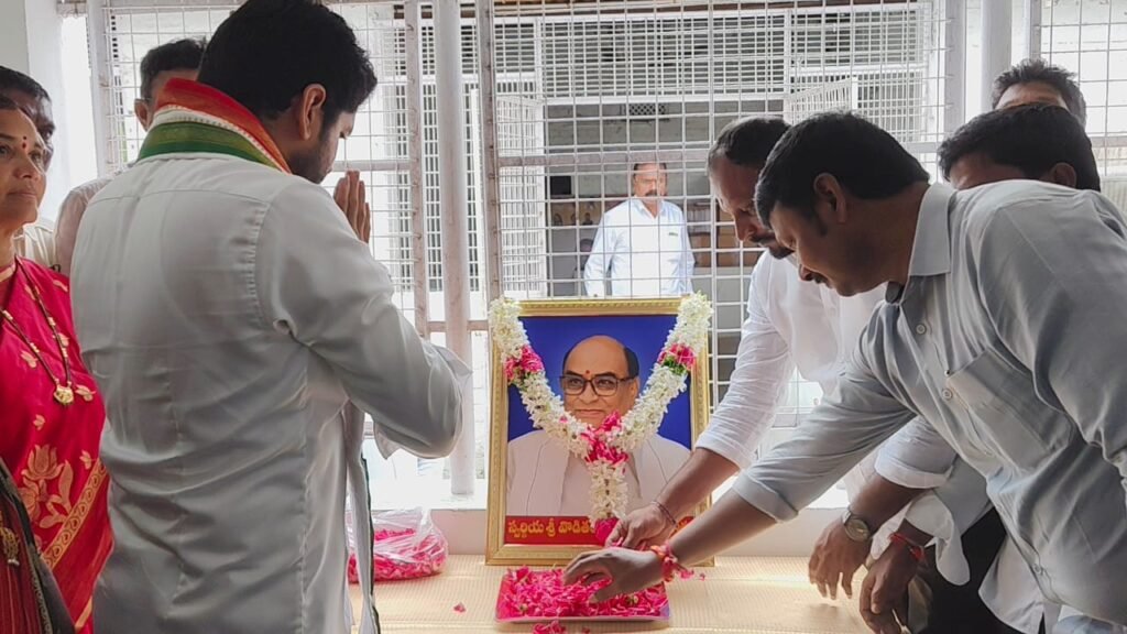 మెయిన్ రోడ్డులోని రాజేశ్వరరావు విగ్రహానికి పూలమాలవేసి నివాళులర్పిస్తున్న మనవడు కాంగ్రెస్ పార్టీ ఇంచార్జ్ ప్రణవ్..