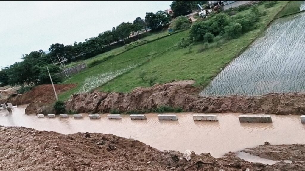 మండల యాదగిరి, స్వర్ణోదయం ప్రతినిధి హుజూరాబాద్, జూలై 27: కరీంనగర్ – వరంగల్ మధ్య నిర్మాణంలో ఉన్న మినహాయింపు రహదారి (బైపాస్ రోడ్) పనుల వల్ల పంట పొలాల్లోకి వరద నీరు చేరి, రైతులు తీవ్ర నష్టానికి గురవుతున్నారు. హుజూరాబాద్ మండలం రాంపూర్ గ్రామంలో పరిస్థితి అత్యంత దయానీయంగా మారింది…రహదారి నిర్మాణ సమయంలో వర్షపు నీరు వెళ్లే మళ్లింపులు, కాల్వలు నిర్లక్ష్యంగా మూసివేయడంతో, పొలాలు నీట మునిగిపోయాయి. వానలకు పంట నష్టపోయిన రైతులు, ఈ నిర్మాణ పనుల కారణంగా ఇంకోసారి నష్టపోతున్నామంటూ ఆవేదన వ్యక్తం చేస్తున్నారు.