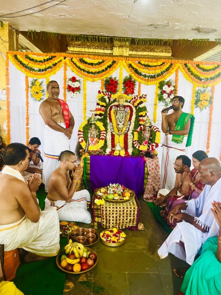 శ్రీ వెంకటేశ్వరస్వామి నూతన ఉత్సవ విగ్రహలకు ప్రాణ ప్రతిష్ఠ నిర్వహిస్తున్న పూజారులు, పాల్గొన్న దాతలు, భక్తులు.