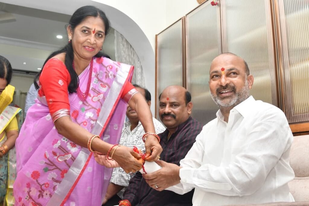 మండల యాదగిరి స్వర్ణోదయం ప్రతినిధి కరీంనగర్ ఆగస్టు 9: రక్షాబంధన్ పర్వదినాన్ని పురస్కరించుకుని కేంద్ర హోంశాఖ సహాయ మంత్రి బండి సంజయ్ కుమార్ స్వగృహంలో సోదరి మణి కావేటి శైలజ ప్రేమపూర్వకంగా రాఖీ కట్టారు. సోదరుడు–సోదరీమణుల అనుబంధానికి ప్రతీకగా జరిగిన ఈ వేడుకలో సాంప్రదాయ పూజా కార్యక్రమాలు నిర్వహించగా, మంత్రి బండి సంజయ్ సోదరికి కానుకలు అందజేశారు. రాఖీతో బంధం మరింత బలపడిందని ఈ సందర్భంగా బండి సంజయ్ హర్షం వ్యక్తం చేశారు. అలాగే కేంద్ర హోమ్ శాఖ సహాయ మంత్రి బండి సంజయ్ కుమార్ కేంద్ర భద్రత సిబ్బందికి బండి సంజయ్ సతీమణి బండి అపర్ణ రాఖీలు కట్టి సోదర భావాన్ని చాటారు.