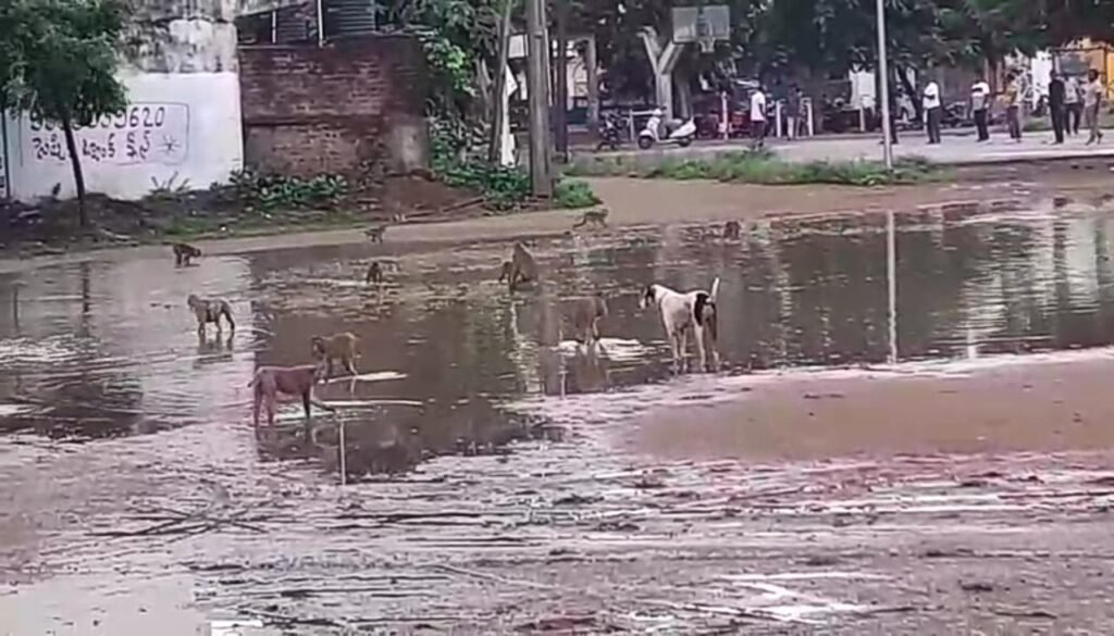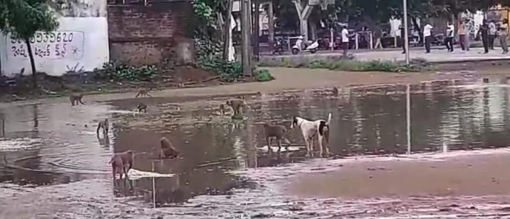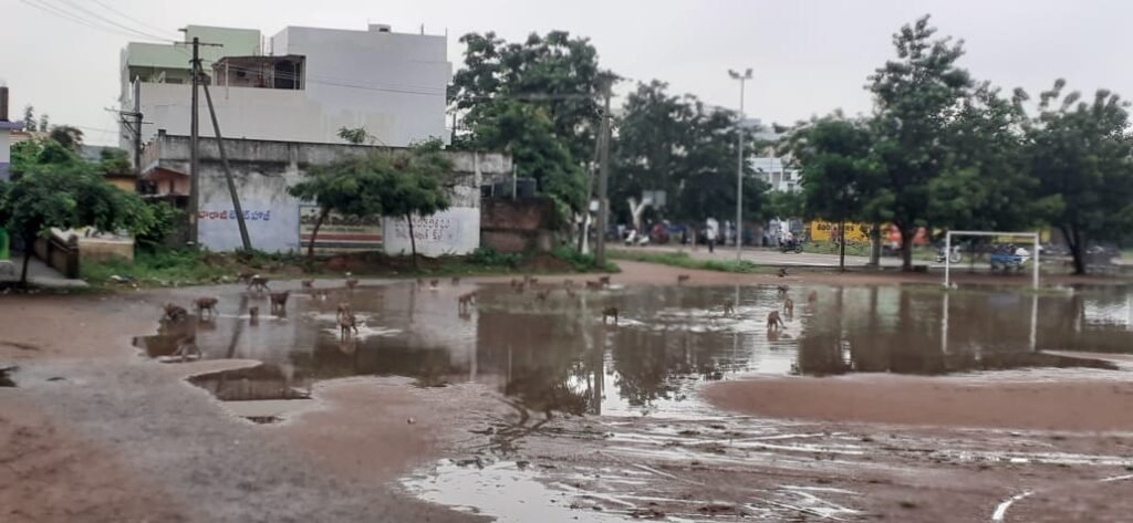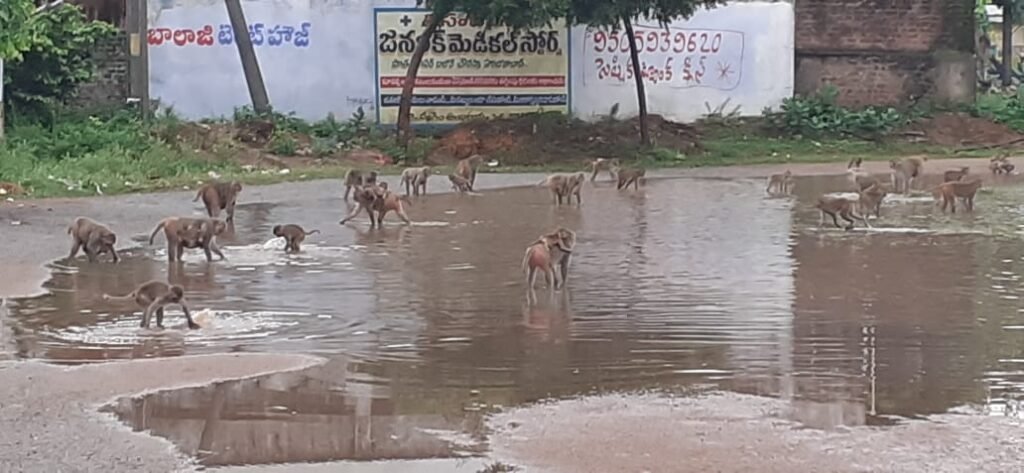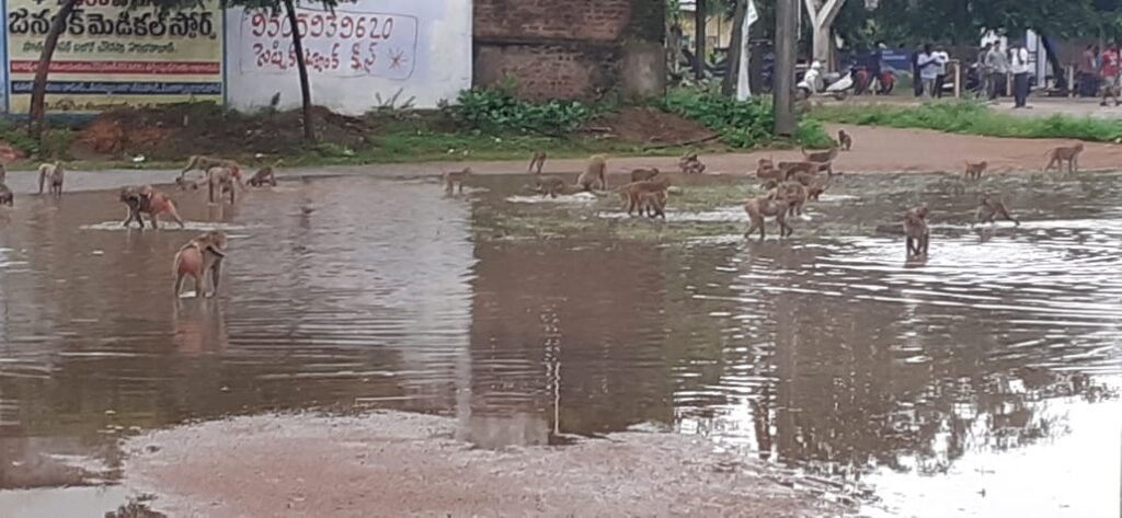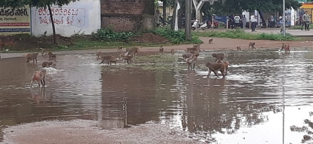 హై స్కూల్ క్రీడా మైదానంలో నిలిచిన నీటిలో ఈదుతూ వాకర్సును ఇబ్బందులకు గురి చేస్తున్న వానరాలు…