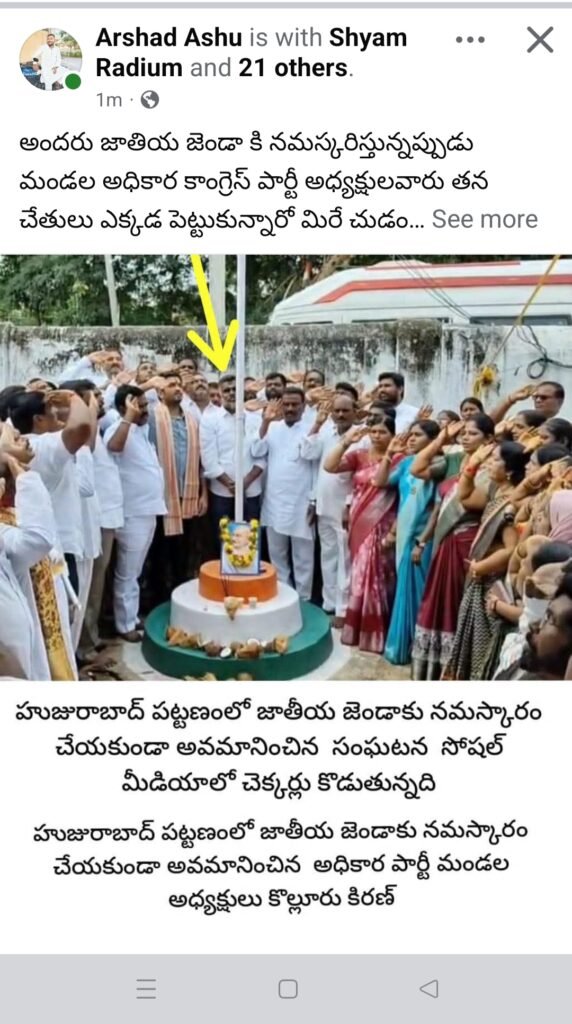 మండల యాదగిరి, స్వర్ణోదయం ప్రతినిధి హుజురాబాద్: జాతీయ జెండాకు అవమానం అంటూ ఒక పోస్ట్ సోషల్ మీడియాలో చక్కర్లు కొడుతుంది. అయితే అది ఏదో అలా అనామకుడికి సంబంధించిన పోస్ట్ కాకపోవడంతో తీవ్ర చర్చనీయాంశంగా మారింది. అధికార కాంగ్రెస్ పార్టీకి చెందిన మండల శాఖ అధ్యక్షుడు కొల్లూరి కిరణ్ నిన్న శుక్రవారం హుజరాబాద్ పార్టీ కార్యాలయంలో (జెండా ఆవిష్కరణ) స్వాతంత్ర దినోత్సవ వేడుకల్లో కాంగ్రెస్ పార్టీ నియోజకవర్గ ఇన్చార్జి వోడితల ప్రణవ్, ఇతర నాయకులందరూ జాతీయ జెండా ఎత్తిన తర్వాత దానికి వందనం(సెల్యూట్) చేస్తుండగా మండల శాఖ అధ్యక్షుడు కిరణ్ మాత్రం చేతులు కిందికి ముడుచుకొని నిలుచొని చూడడం కనీసం జెండాకు సెల్యూట్ చేయకపోవడం దీనంతటికీ కారణంగా నిలుస్తుంది. జాతీయ జెండాకు ఏ చిన్నపాటి అవమానం జరిగిన భారత రాజ్యాంగం ప్రకారం శిక్షార్హుడుగా ప్రకటించడం జరుగుతుంది. కానీ ఎంతోమంది సాక్షిగా అందరూ చూస్తుండగానే జాతీయ జెండాకు సెల్యూట్ చేయవలసిన ఒక గౌరవ ప్రదమైన (కాంగ్రెస్ పార్టీ మండల శాఖ అధ్యక్షుడు) హోదాలో ఉండి జాతీయ జెండాకు సెల్యూట్ చేయకపోవడం తీవ్ర విమర్శలకు దారితీస్తుంది. ఏది ఏమైనా జాతీయ జెండాను అవమానించిన కాంగ్రెస్ పార్టీ మండల అధ్యక్షుడు కొల్లూరి కిరణ్ తీరుపై ప్రభుత్వం, అధికారులు, ఆ పార్టీ అధినాయకత్వం ఏ విధంగా స్పందిస్తారో వేచి చూడాల్సిందే మరీ!