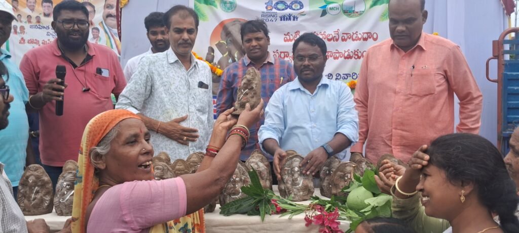 ఉచితంగా మట్టి వినాయకులను పంపిణీ చేస్తున్న మున్సిపల్ కమిషనర్ సమ్మయ్య, పాల్గొన్న పురోహితుడు భాస్కర్ శర్మ..