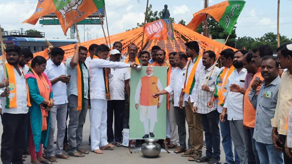 ప్రధాని మోడీ చిత్రపటానికి పాలాభిషేకం చేస్తున్న బిజెపి జిల్లా అధ్యక్షుడు కృష్ణారెడ్డి…