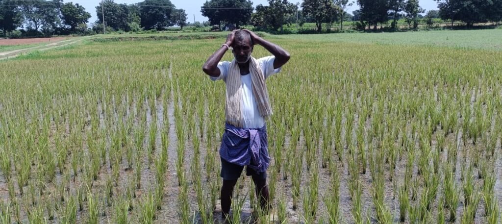 పచ్చని వరి పంటకు గడ్డి మందు కొట్టడంతో వాడిపోయి ఎండు ముఖం పట్టిన పోలాన్ని చూసి బోరున విలపిస్తున్న రైతు బాగోతం వెంకటయ్య …