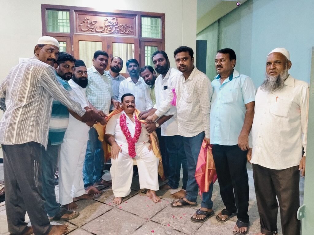 ముజాహిద్ హుస్సేన్ ను శాలువాలు కప్పి, పూలమాల వేసి ఘనంగా సత్కరిస్తున్న ముస్లిం మైనార్టీ నాయకులు, స్వర్ణోదయం ప్రతినిధి యాదగిరి..