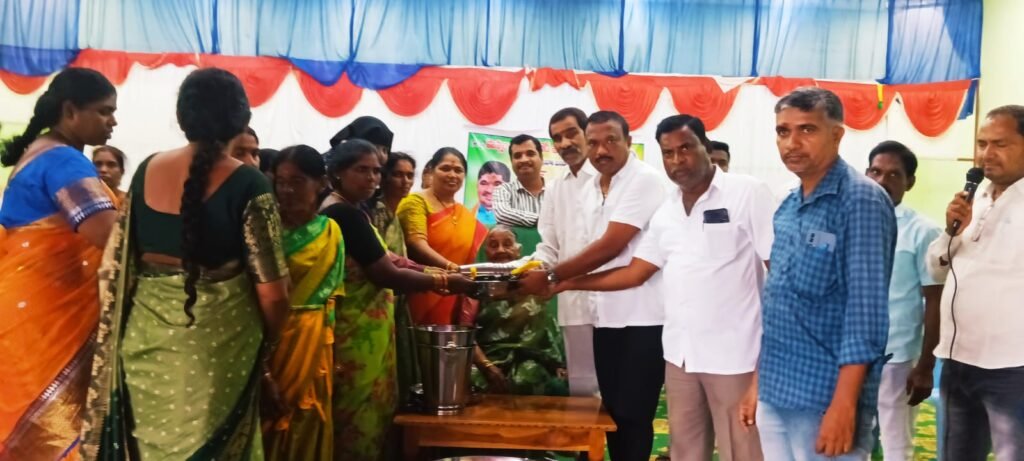 మహిళా గ్రామైక్య సంఘాలకు స్టీలు బ్యాంకు వితరణ చేస్తున్న మంత్రి తల్లి పొన్నం మల్లమ్మ, సతీమణి మంజుల..