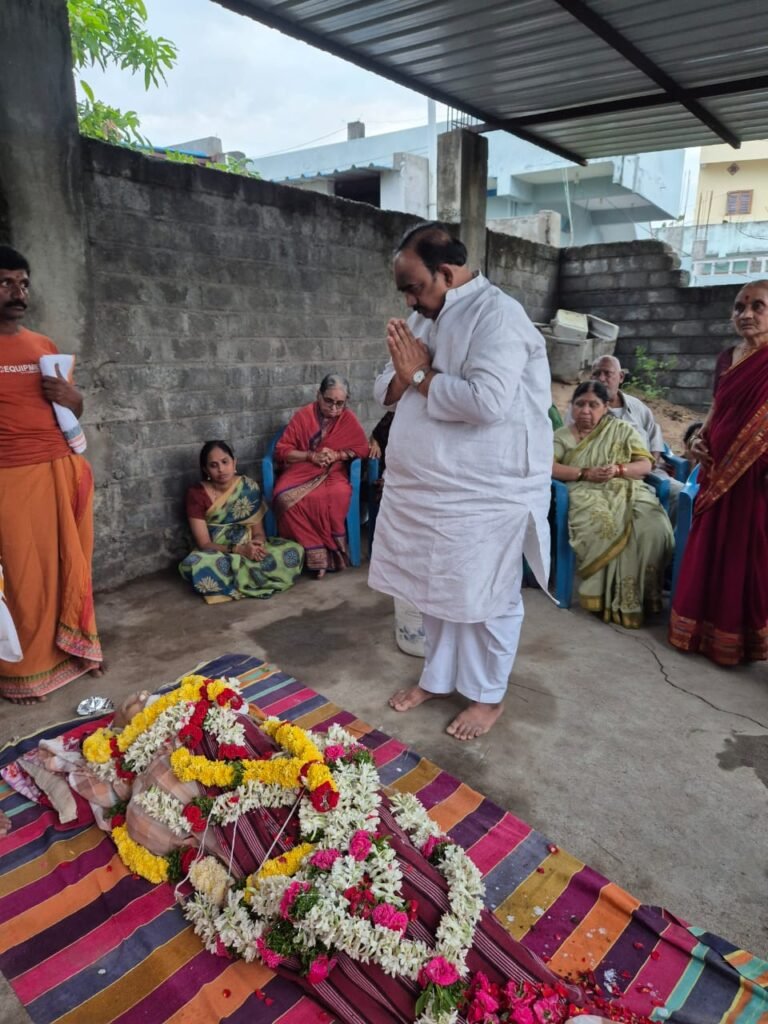 మండల యాదగిరి, స్వర్ణోదయం ప్రతినిధి హుజురాబాద్, సెప్టెంబర్ 28: హుజురాబాద్ పట్టణానికి చెందిన వేద పండితులు, ప్రముఖ పురోహితులు అవధానుల దత్తాత్రేయశర్మ (దత్తయ్య గారు) (95) ఆదివారం ఉదయం మృతి చెందారు. దత్తయ్యగారి పార్థివ దేహాన్ని మాజీ రాజ్యసభ సభ్యులు కెప్టెన్ వి లక్ష్మీ కాంతారావు సరోజినీదేవి దంపతులు, హుజురాబాద్ ఎమ్మెల్యే పాడి కౌశిక్ రెడ్డి, హుస్నాబాద్ మాజీ శాసనసభ్యులు వి సతీష్ కుమార్ లు సందర్శించి నివాళులర్పించారు. కుటుంబ సభ్యులను పరామర్శించారు. దత్తయ్యగారి మృతి తీరనిలోటని అన్నారు. ఆయన జిల్లా, రాష్ట్రవ్యాప్తంగా ఎంతో పేరు ప్రఖ్యాతులు తెచ్చుకున్నారని, సంస్కృతి సాంప్రదాయాలను పరిరక్షించేందుకు కృషి చేశారని ప్రశంసించారు. ఆయన మృతికి సంతాపాన్ని కుటుంబ సభ్యులకు సానుభూతిని తెలిపారు. తమ కుటుంబానికి దత్తయ్యతో ఎంతో అనుబంధం ఉందని, తమకు అన్ని విషయాల్లో మార్గ నిర్దేశం చేసేవారని, పెద్దవారిగా ప్రోత్సహించేవారని, ఎంత దిగిన వొదిగి ఉండేవారని, ప్రతి ఒక్కరిని ఆత్మీయంగా పలకరించేవారని గుర్తు చేసుకున్నారు. వారి వెంట బిఆర్ఎస్ పార్టీ నాయకులు, కార్యకర్తలు ఉన్నారు.