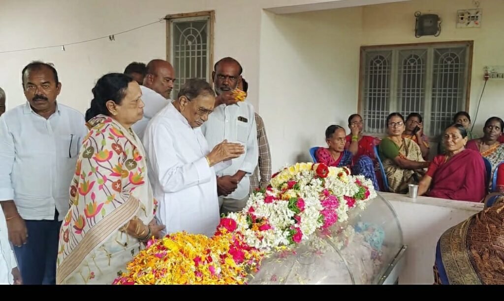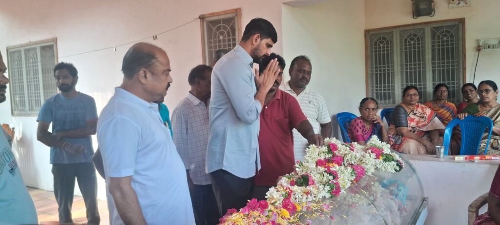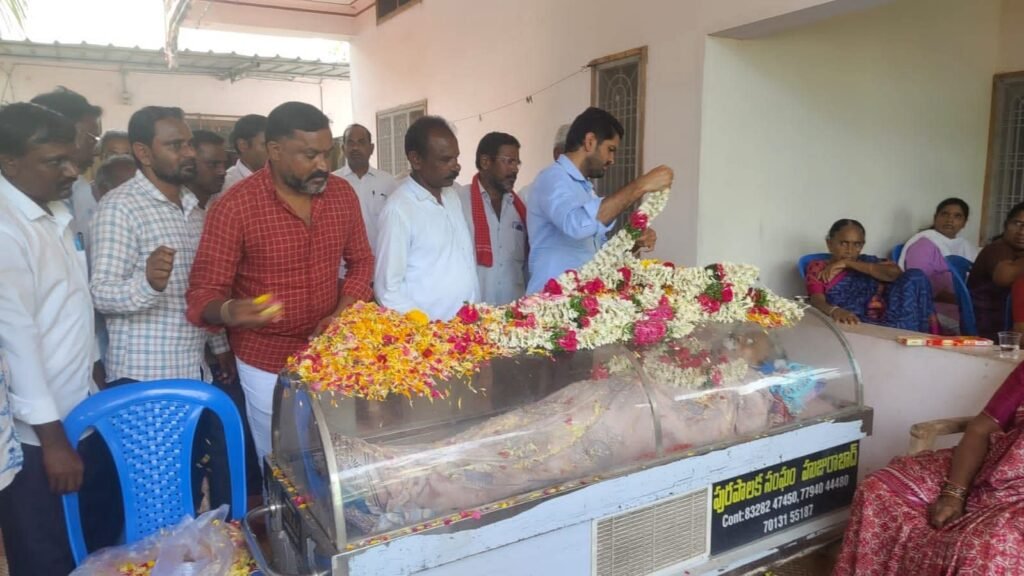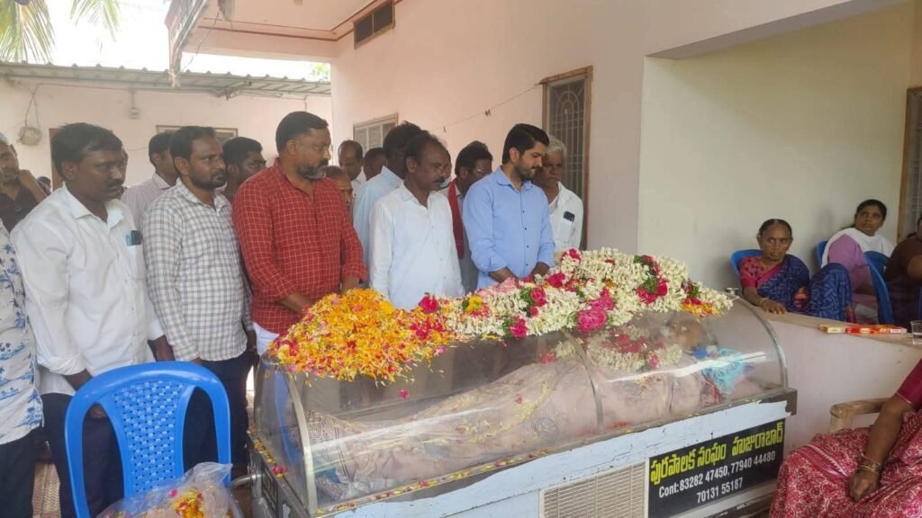 బక్కారెడ్డి మృతదేహంపై పూలమాల వేసే నివాళులర్పిస్తున్న కాంగ్రెస్ పార్టీ నియోజకవర్గ ఇన్చార్జ్ వోడితెల ప్రణవ్
