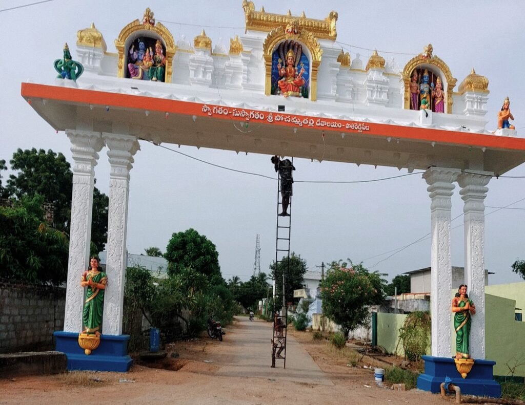 గ్రామానికి స్వాగతం పలికే తోరణాన్ని అందంగా అలంకరిస్తున్న దృశ్యం..