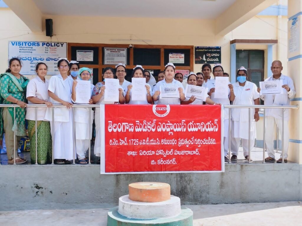 మండల యాదగిరి, స్వర్ణోదయం ప్రతినిధి హుజురాబాద్: తమ వేతనాలు చెల్లించడంలో ప్రభుత్వం నిర్లక్ష్యం చేయడం పట్ల నిరసిస్తూ హుజురాబాద్ ప్రభుత్వ ఏరియా ఆసుపత్రి లో పనిచేసే వైద్య విధాన పరిషత్ ఉద్యోగులు శుక్రవారం ఆసుపత్రి ముందు మౌన ప్రదర్శన చేసి వినూత్నంగా నిరసన తెలిపారు. వేతనాలు సక్రమంగా అందక పోవడంతో తమ ఆవేదనను ప్రభుత్వం అర్థం చేసుకోవాలనీ తెలంగాణ మెడికల్ ఎంప్లాయిస్ యూనియన్ ఆధ్వర్యంలో ఉద్యోగులు ప్లకార్డులు చేత పట్టుకొని నిశ్శబ్దంగా నిరసన తెలిపారు. ప్రభుత్వ వైఖరి వల్ల తాము తమ కుటుంబ సభ్యులు తీవ్ర ఇబ్బందులు గురవుతున్నారని అన్నారు వేతనాలు ఆలస్యం వల్ల కష్టాలు పడుతున్నామని వెంటనే పరిష్కరించాలని కోరారు. ఈ కార్యక్రమంలో టిజిఎo ఈయు రాష్ట్ర ఉపాధ్యక్షురాలు స్వాతి పలువురు ఉద్యోగులు పాల్గొన్నారు.
