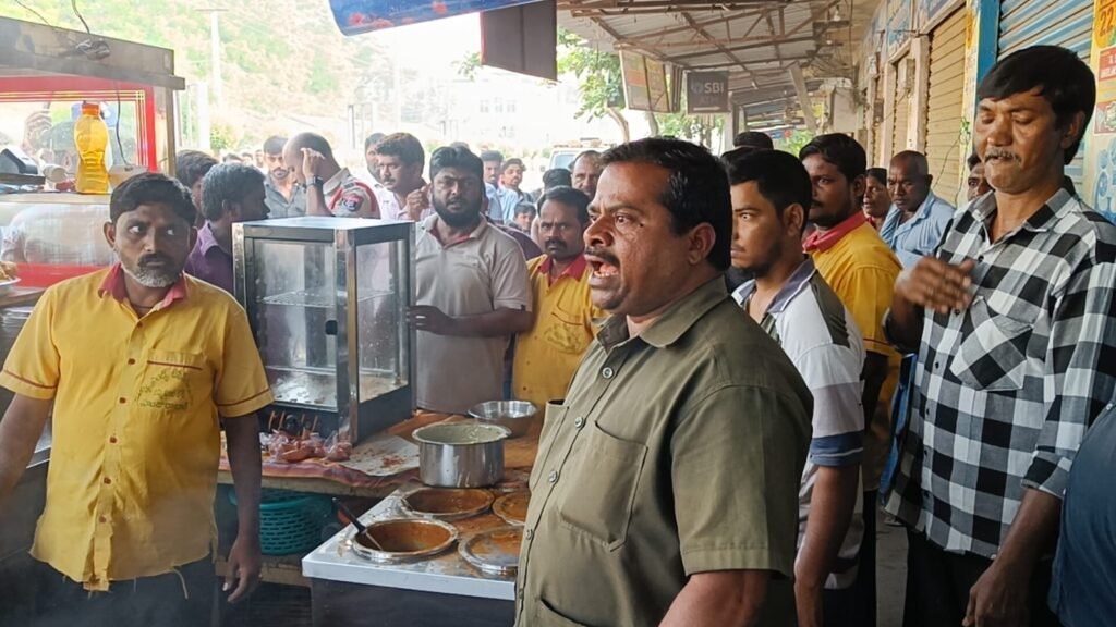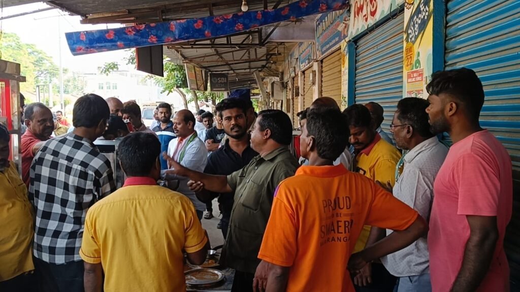 జమ్మికుంట రోడ్ లో ఓ హోటల్ నిర్వాహకుడు నడుపుతుండగా ఆందోళన కారులతో వాగ్వాదం జరుగుతున్న దృశ్యం..