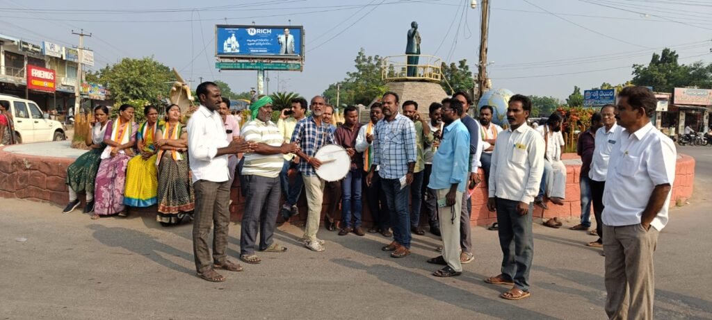 కళాకారుల ఆటపాటలతో నిరసన వ్యక్తం చేస్తున్న అఖిలపక్ష, దళిత ప్రజా సంఘాల నాయకులు..