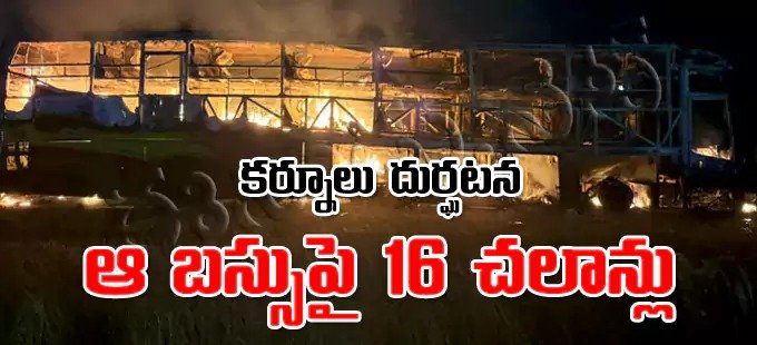 కర్నూలు దుర్గటనకు కారణమైన బస్సు పైన 16 చలాన్లు ఉన్నట్లు ఆర్టిఏ అధికారులు తెలిపారు.