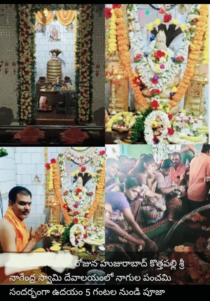 హుజురాబాద్ మునిసిపల్ పరిధిలోని కొత్తపల్లి నాగేంద్రస్వామి దేవాలయంలో శనివారం నాగుల చవితి వేడుకలను ప్రజలు భక్తిశ్రద్ధలతో ఘనంగా జరుపుకున్నారు. నాగుల చవితిని పురస్కరించుకొని దేవాలయ ఆవరణలో భక్తుల కోసం ఆలయ ప్రధాన పూజారి పందిళ్ళ భాస్కర్ శర్మ ప్రత్యేక ఏర్పాట్లు చేశారు. హుజురాబాద్ పట్టణం తో పటు చుట్టుపక్కల గ్రామాల ప్రజలు వివిధ మండలాల నుండి పెద్ద ఎత్తున భక్తులు ఉదయం నుండి దేవాలయంకు వచ్చి పుట్టలో పాలు పోసి, నాగేంద్రుడికి నవరసాభిషేకము, పంచామృతాలతో శివుడికి ప్రత్యేక పూజలు నిర్వహించారు. తమ కుటుంబాన్ని చల్లగా చూడాలని భక్తులు వేడుకున్నారు. అనంతరం భక్తులకు పేద పండితుడు, పూజారి భాస్కర్ శర్మ తీర్థ ప్రసాదములను అందజేశారు. ఈ కార్యక్రమంలో వివిధ పార్టీల నాయకులు, మాజీ ప్రజా ప్రతినిధులు, మహిళలు, పెద్ద ఎత్తున పాల్గొన్నారు.