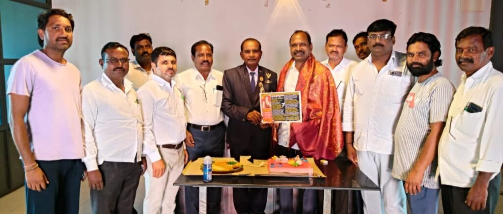 కేక్ కట్ చేసిన తర్వాత విజయ్ కుమార్ కు కేక్ తినిపిస్తున్న కవి సత్యం గౌడ్..