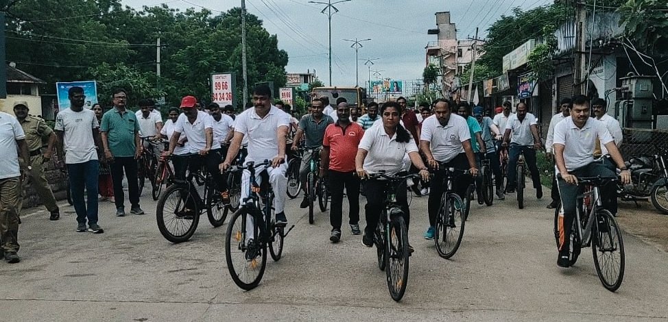 సైకిల్ ర్యాలీలో సైకిల్ తొక్కుతూ పాల్గొన్న ఏసిపి, సీఐలు, ఎస్ఐలు, ప్రజలు..