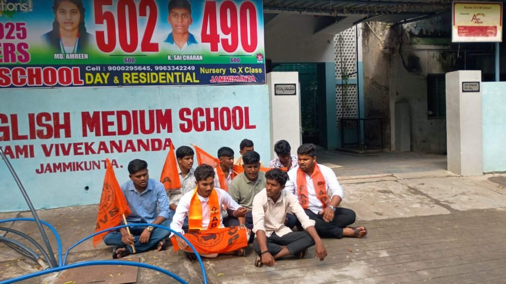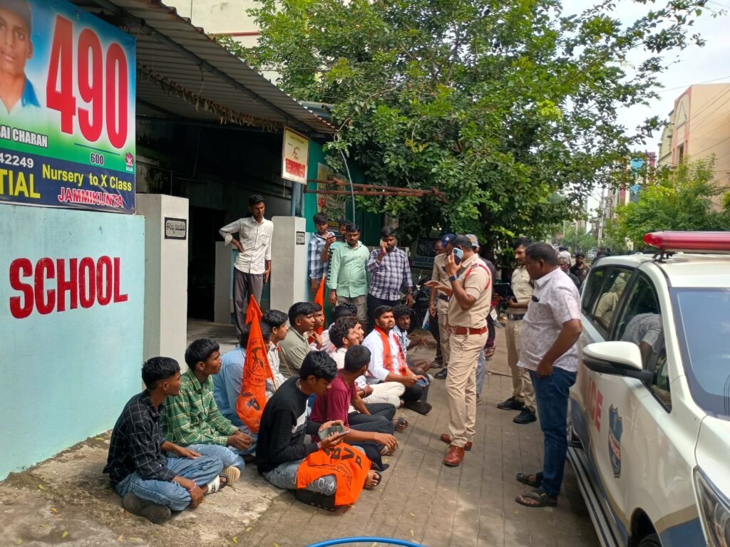 పాఠశాల వద్ద ధర్నా నిర్వహిస్తున్న ఏబీవీపీ నాయకులు..