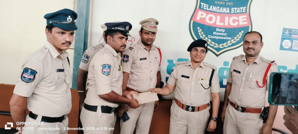 దొంగను పట్టుకోవడంలో ప్రతిభ కనబరిచిన పోలీసులను నగదు బహుమతితో సత్కరిస్తున్న ఏసిపి మాధవి, పక్కన సిఐ రామకృష్ణ గౌడ్, ఎస్ఐ సతీష్ తదితరులు..