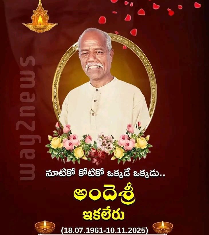 మండల యాదగిరి, స్వర్ణోదయం ప్రతినిధి కరీంనగర్: తెలంగాణ రాష్ట్ర సాధన కోసం సాగిన సాంస్కృతిక ఉద్యమంలో కవిగా తన పాటలతో, సాహిత్యంతో కీలక పాత్ర పోషించిన తెలంగాణ రాష్ట్ర గీతం జయ జయ హే తెలంగాణ సృష్టికర్త అందెశ్రీ మరణం తెలంగాణకు తీరని లోటని, యావత్ తెలంగాణ ప్రజానీకానికి తీవ్ర దిగ్భ్రాంతికి గురి చేసిందని రైతు ప్రజా సంఘాల సమాఖ్య జాతీయ అధ్యక్షుడు పోలాడి రామారావు తీవ్ర ఆవేదన వ్యక్తం చేశారు. సోమవారం కరీంనగర్ లో ప్రజా సంఘాల సమాఖ్య నాయకులతో నిర్వహించిన అందెశ్రీ సంతాప కార్యక్రమంలో పోలాడి రామారావు మాట్లాడుతూ తెలంగాణ రాష్ట్ర సాధన ఉద్యమ కాలంలో అందెశ్రీ రాసిన జయ జయ హే తెలంగాణ గీతంతో ఒళ్ళు పులకరించి ఉద్యమానికి ఉత్సాహం నింపేదన్నారు.