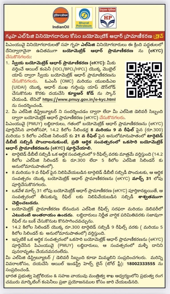 *స్వయంగా బయోమెట్రిక్ ప్రామాణికరణ EKYC చేసుకునే వారు ఆయిల్ కంపనీ(IOCL/BPCL/HPCL) మొబైల్ ఆప్ ద్వారా EKYC చేసుకోవచ్చని ఆయన తెలిపారు.