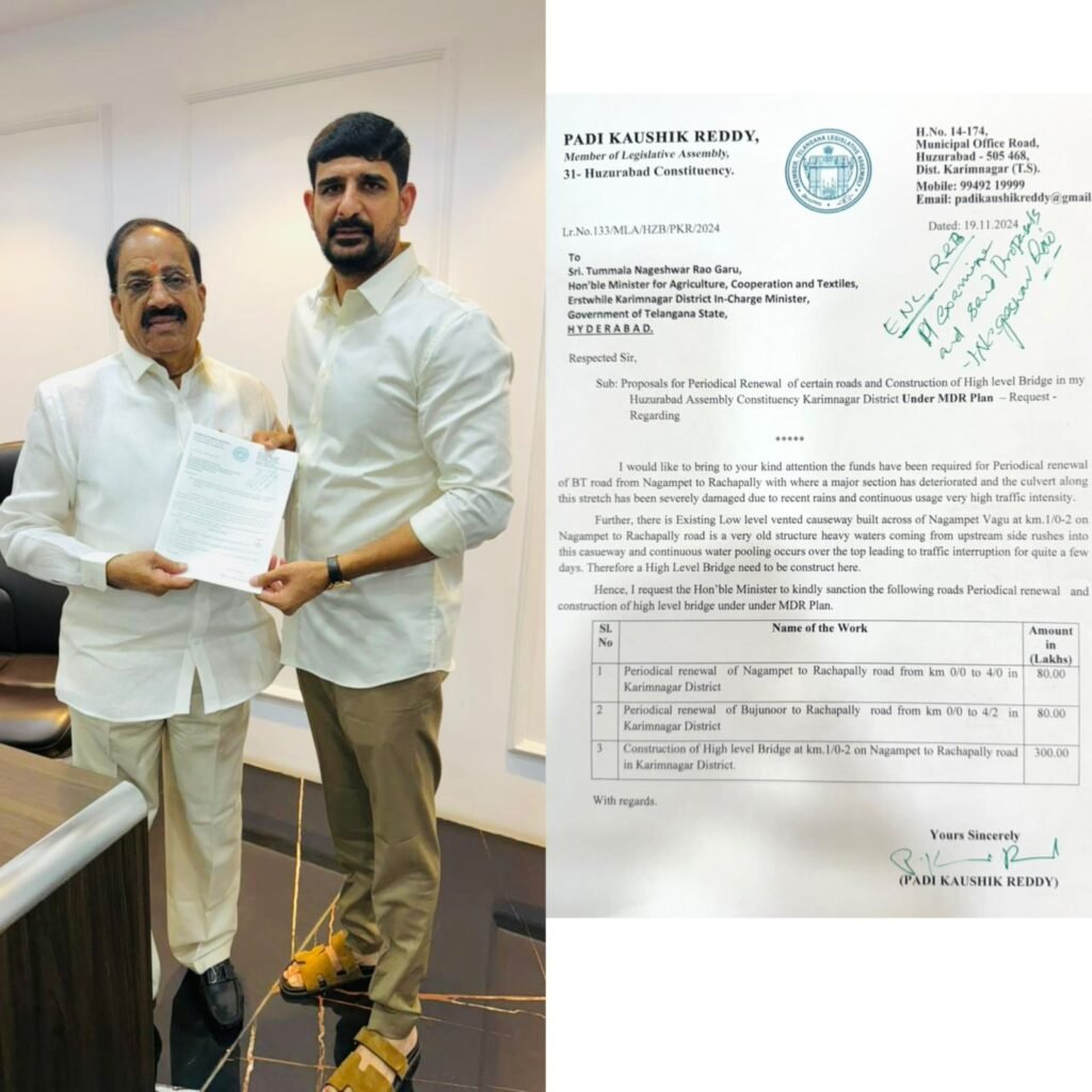 కరీంనగర్ జిల్లా ఇంచార్జ్ మంత్రి తుమ్మల నాగేశ్వరరావుకు విజ్ఞాపన పత్రం అందజేస్తున్న హుజురాబాద్ ఎమ్మెల్యే పాడి కౌశిక్ రెడ్డి…