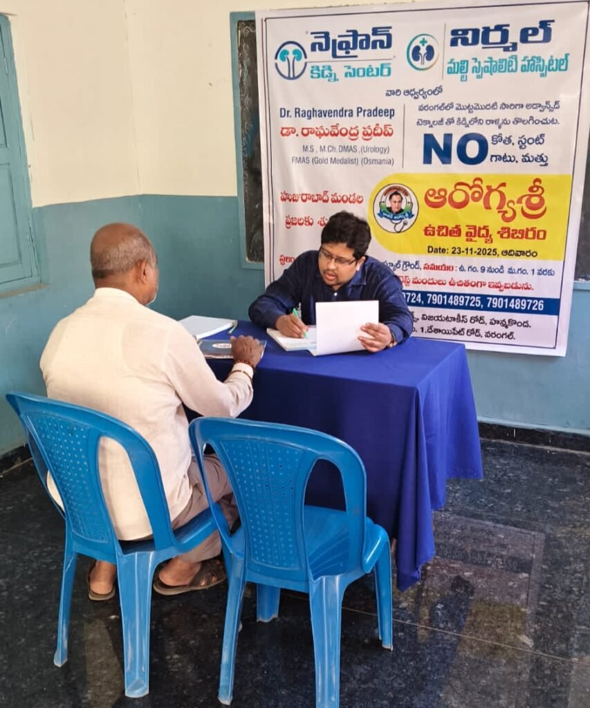 మండల యాదగిరి, స్వర్ణోదయం ప్రతినిధి హుజురాబాద్: హనుమకొండ లోని నెఫ్రాన్ కిడ్నీ సెంటర్, నిర్మల్ మల్టీ స్పెషాలిటీ హాస్పిటల్ వారి ఆధ్వర్యంలో యూరాలజిస్ట్, గోల్డ్ మెడల్ గ్రహీత డాక్టర్ రాఘవేంద్ర ప్రదీప్ సమక్షంలో హుజురాబాద్ పట్టణంలోని ప్రభుత్వ ఉన్నత (ప్రాథమికొన్నత) పాఠశాల ఆవరణంలో ఆదివారం నిర్వహించిన ఉచిత వైద్య శిబిరానికి ప్రజల నుండి విశేష స్పందన లభించింది. హనుమకొండ లోని నెఫ్రాన్ కిడ్నీ సెంటర్, నిర్మల్ మల్టీ స్పెషాలిటీ హాస్పిటల్ వారి ఆధ్వర్యంలో యూరాలజిస్ట్, గోల్డ్ మెడల్ గ్రహీత డాక్టర్ రాఘవేంద్ర ప్రదీప్ తోపాటు ఈ వైద్య శిబిరానికి పలు రకాల వైద్య నిపుణులు హాజరై అక్కడికి వచ్చిన ప్రజలను ఆరోగ్యశ్రీలో భాగంగా అన్ని రకాల పరీక్షలు నిర్వహించి ఉచితంగా మందులు పంపిణీ చేశారు. నిర్మల్ మల్టీ స్పెషాలిటీ హాస్పిటల్ ఆధ్వర్యంలో వైద్య సిబ్బంది కిడ్నీ ప్రోస్టేట్, మరియు అన్ని రకముల కిడ్నీ సంబంధ, మూత్ర సంబంధించిన అన్ని రకాల పరీక్షలను నిర్వహించారు. ప్రజలు మారుతున్న కాలానుగుణంగా ఆహార అలవాట్లలో జాగ్రత్తలు తీసుకోవాలని చిన్నపాటి నిర్లక్ష్యంతోనే జబ్బుల బారిన పడుతున్నారని యూరాలజిస్ట్ గోల్డ్ మెడలిస్ట్ డాక్టర్ రాఘవేంద్ర ప్రదీప్ పేర్కొన్నారు. ఉచిత వైద్య శిబిరాలను స్థానిక ప్రజలు సద్వినియోగం చేసుకోవాలని, అలాంటి అవకాశాన్ని నిర్లక్ష్యం చేయరాదన్నారు. హుజురాబాద్ లో నిర్వహించిన ఉచిత వైద్య శిబిరానికి ప్రజల నుండి చక్కని స్పందన లభించిందని వందకు పైగా మంది హాజరై వైద్య పరీక్షలు చేయించుకున్నారని ఆయన తెలిపారు. ఎవరికైనా మూత్రపిండాలకు సంబంధించిన సమస్య ఉన్న ఎలాంటి జబ్బు ఉన్న తమ నెఫ్రాన్ కిడ్నీ సెంటర్ ను, నిర్మల్ మల్టీ స్పెషాలిటీ హాస్పిటల్ ను సందర్శించి ఆరోగ్యశ్రీలో ఉచిత వైద్యం పొందవచ్చునని డాక్టర్ రాఘవేంద్ర ప్రదీప్ సూచించారు. ఈ కార్యక్రమంలో ఆయా ఆసుపత్రుల వైద్యులు, ఇతర వైద్య సిబ్బంది పాల్గొన్నారు.